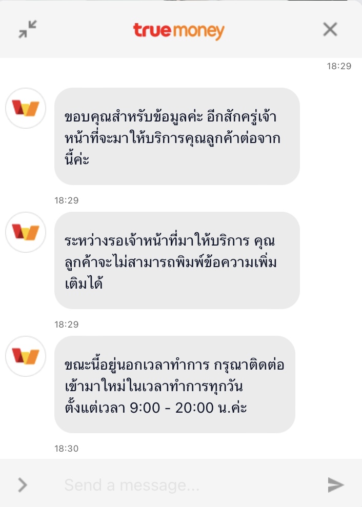เวลาทำการแชทของ truemoney กี่โมงกันแน่คะ
