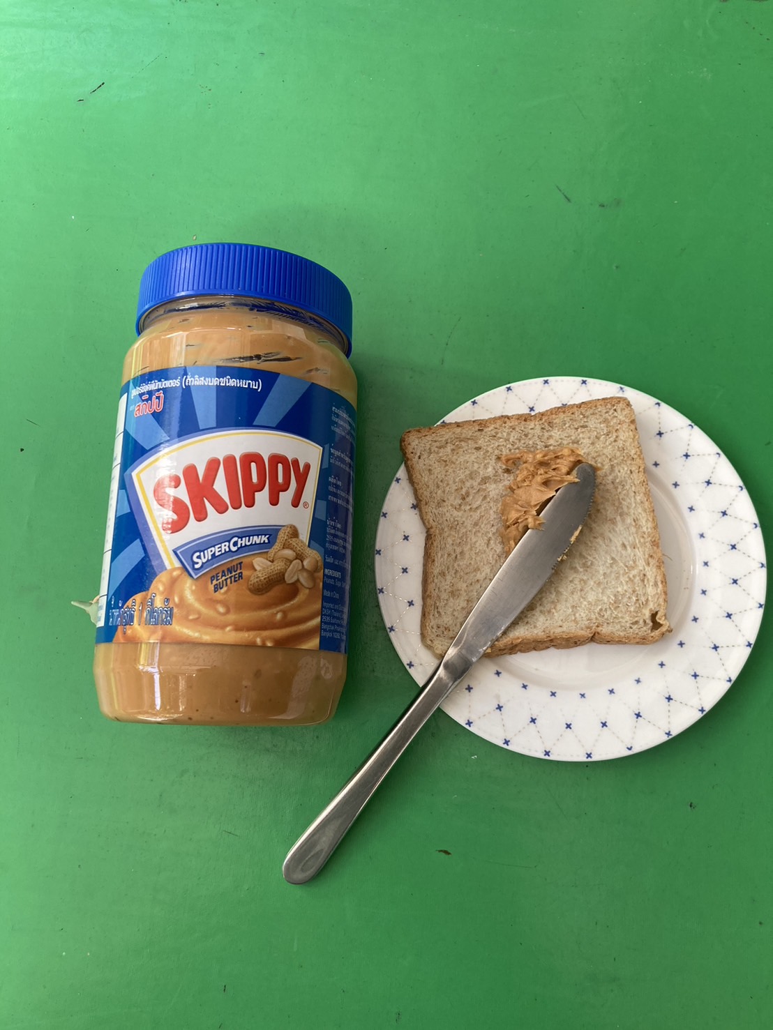 ตามมาด้วย ขนมปังทาเนยถั่ว ไม่อิ่มให้รู้ไป วันก่อน เจอคุณป้านั่งปิ้งข้าวเกรียบว่าว เลยซื้อมาด้วย ชอบกินอยู่แล้ว ยังกรอบอยู่
