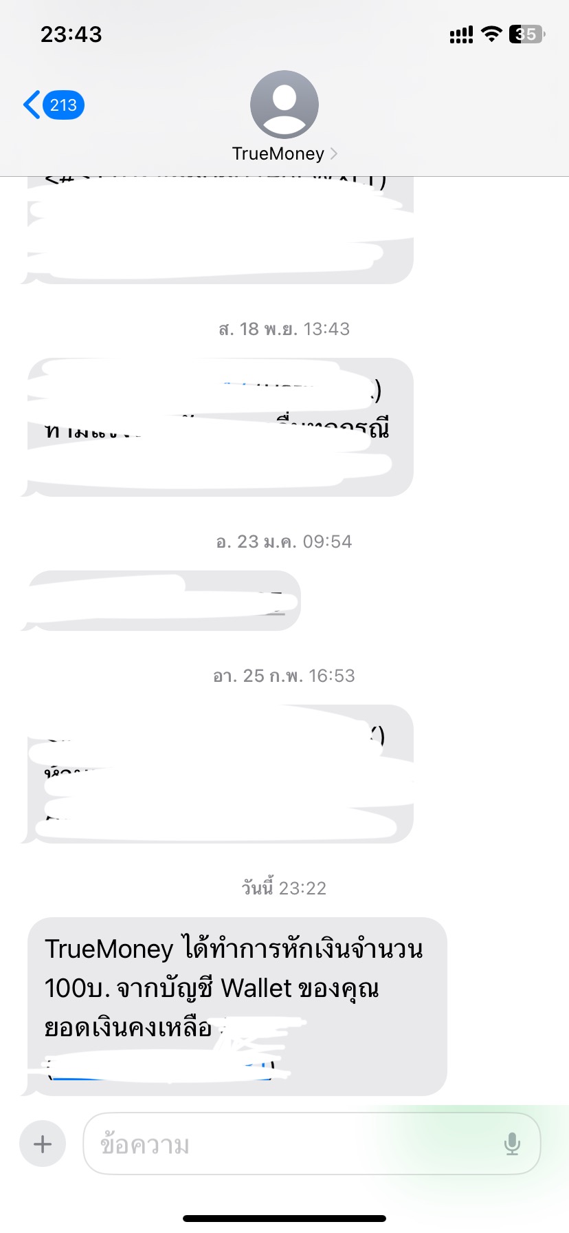 อยู่ๆ ข้อความก็แจ้งเตือนว่า TrueMoney ได้ทำการหักเงินจำนวน 100บ. จากบัญชี Wallet ของคุณ ยอดเงินคงเหลือ X บ.