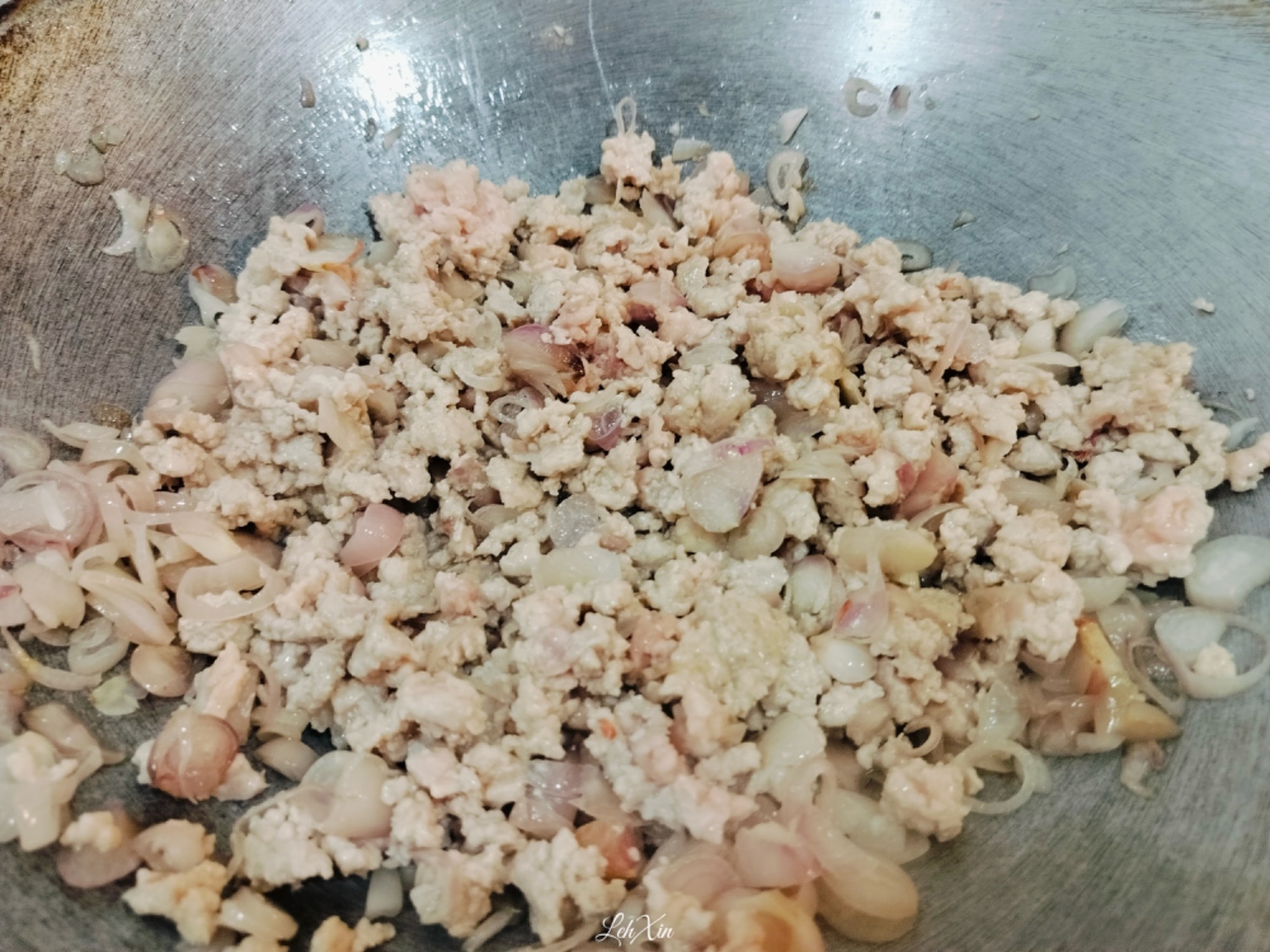 สับหมูให้ละเอียด ปรุงรสด้วยน้ำปลา