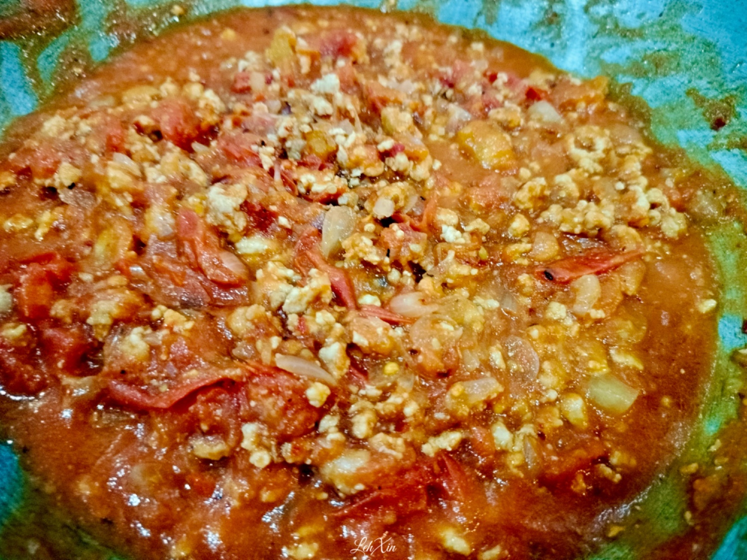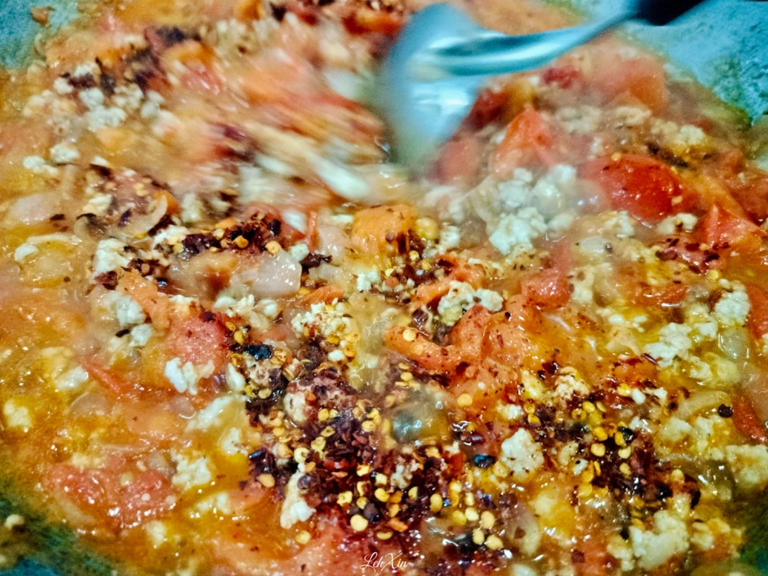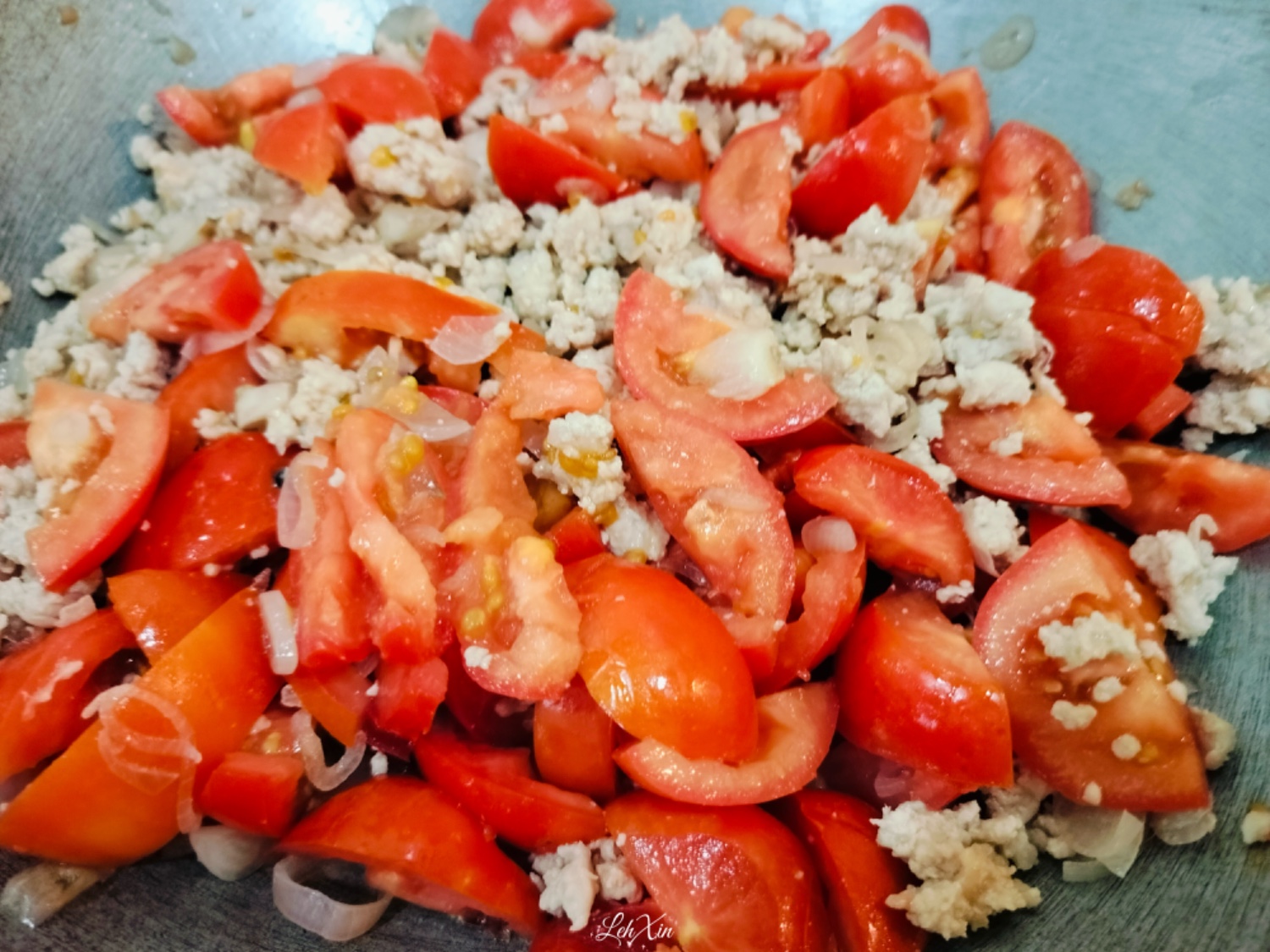 2. ตั้งกระทะ ใส่น้ำมันพืช รอจนร้อน เทหอมแดงลงไปผัดจนเริ่มใส จากนั้นใส่เนื้อหมูลงไป ผัดคลุกเคล้าจนเนื้อหมูเริ่มสุก ใส่น้ำตาลทรายลงไป ผัดต่อ จากนั้นใส่มะเขือเทศลงไป ผัดจนมะเขือเทศเริ่มสลด (ไม่ต้องเติมน้ำนะคะ เวลาผัดจะมีน้ำจากมะเขือเทศออกมาเรื่อยๆ ) เติมพริกป่นลงไป ผัดต่อซักครู่ จากนั้นลดไฟเหลือปานกลาง เคี่ยวประมาณ 10 นาทีจนน้ำงวด ชิม ถ้ารสชาติยังไม่พอดี ปรุงรสเพิ่ม