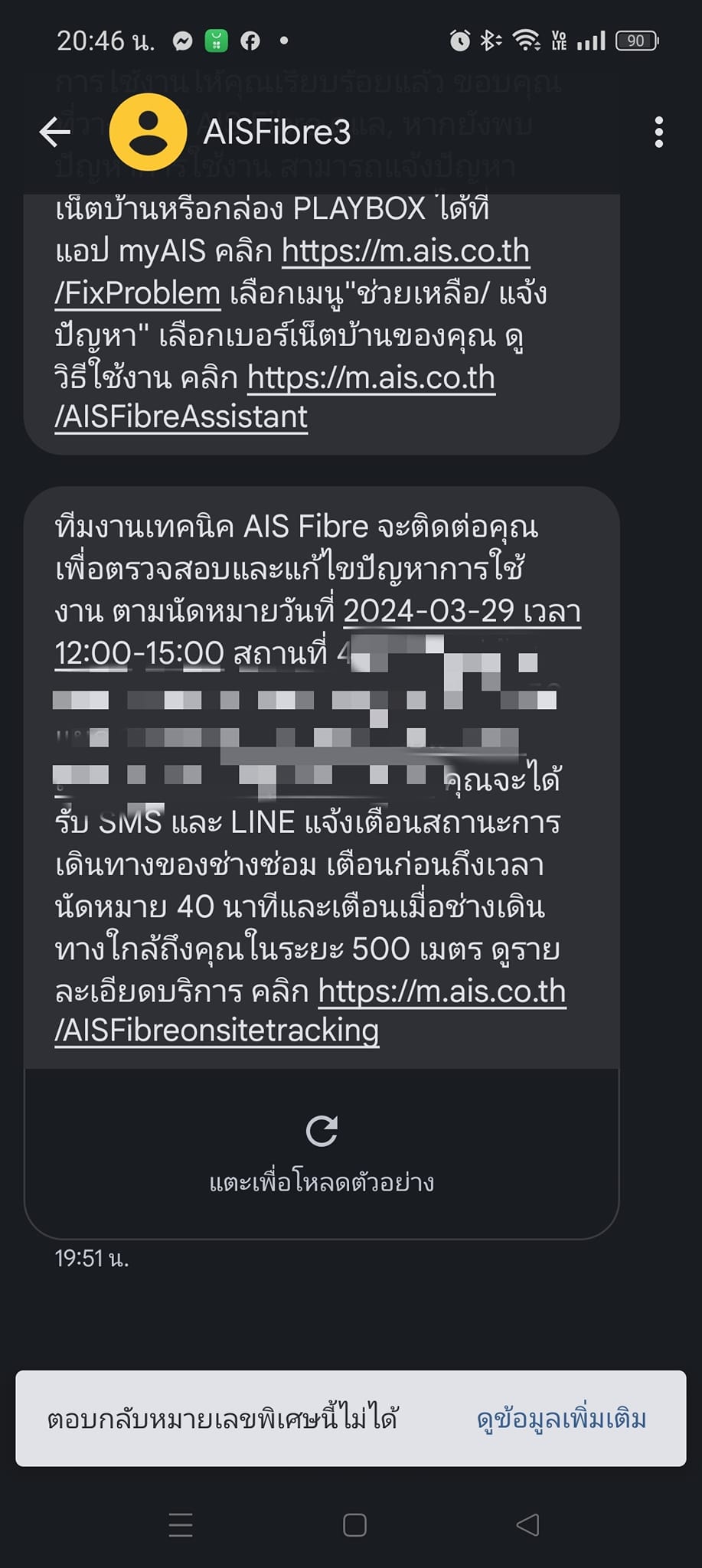 - วันเสาร์ที่ 9 มี.ค.67 มีการปรับปรุงสายไฟฟ้า ทำให้ไฟฟ้าดับ ทำให้แพคเกจเก่าที่ผมใช้งานหลุดออก แล้วแพคเกจเข้ามาแทนที่ ทำให้ไม่สามารถใช้งานได้ ผมจึงโทรเข้าแจ้งปัญหา และขอให้นัดมาติดตั้งใหม่โดยเร็วที่สุด เพราะเลยวันกำหนดติดตั้ง และแพคเกจใหม่เข้ามาเรียบร้อยแล้ว