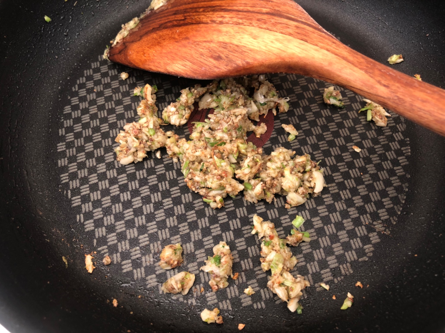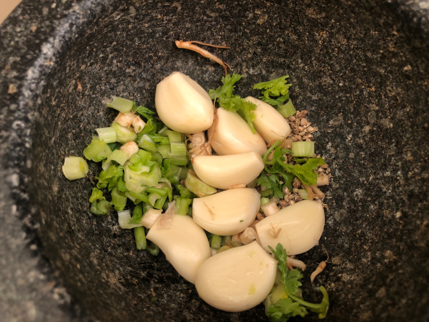 ตำ พริกไทย รากผักชี กระเทียม เอาไปเจียวใส่น้ำมันเล็กน้อย พักไว้