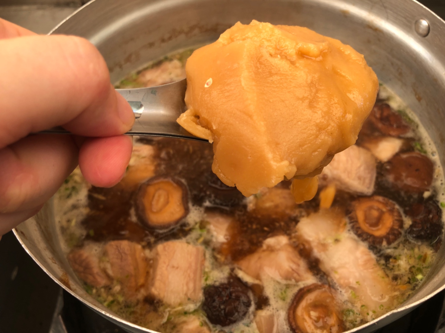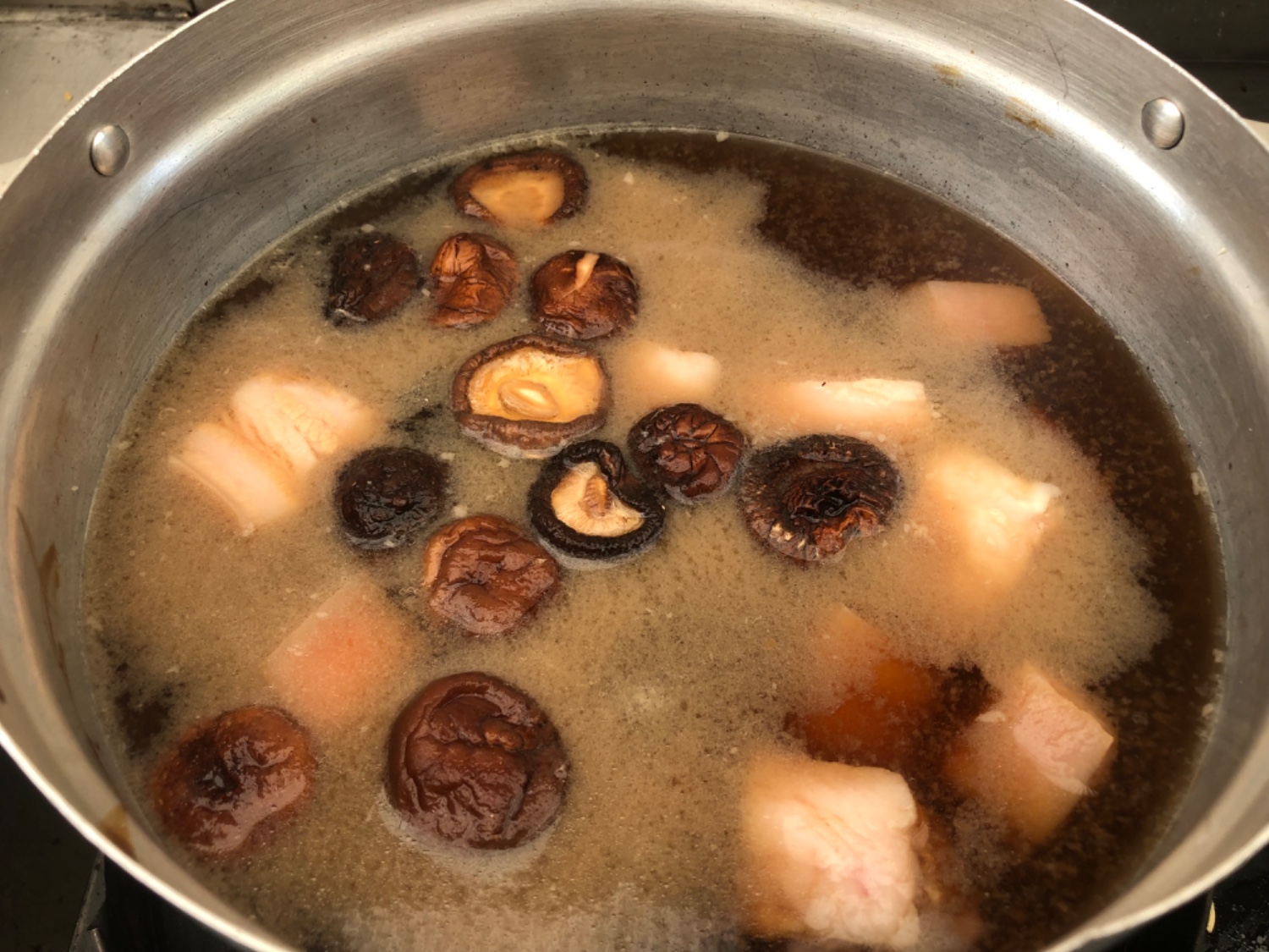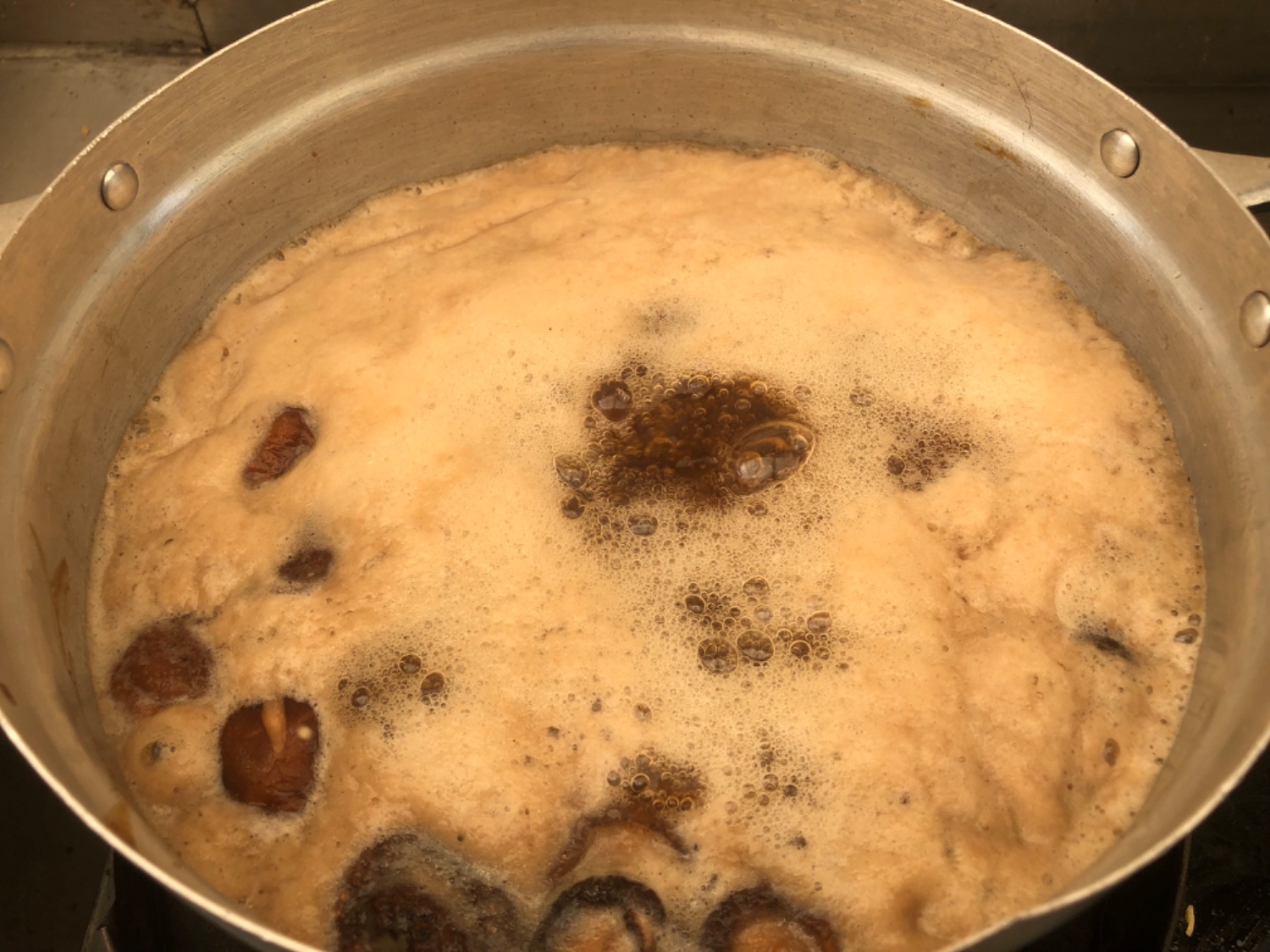 เติมน้ำเปล่า ใส่เห็ดหอม ตั้งไฟแรงจนเดือด ตักฟองออกให้หมด ลดไฟลง ใส่สามเกลอที่เจียวไว้ ใส่น้ำมะพร้าว