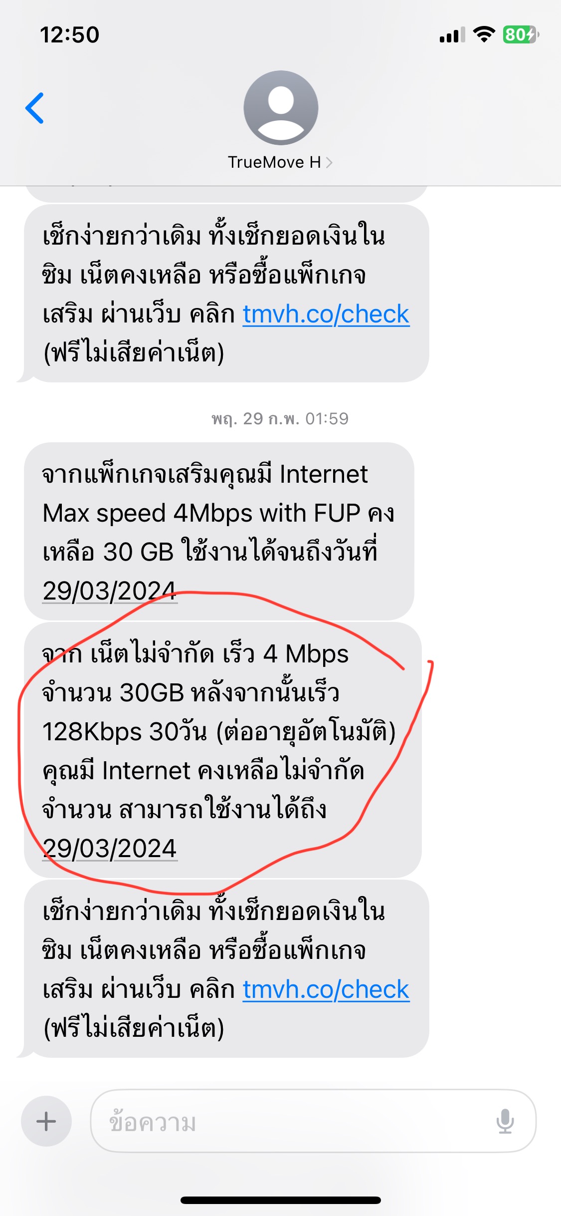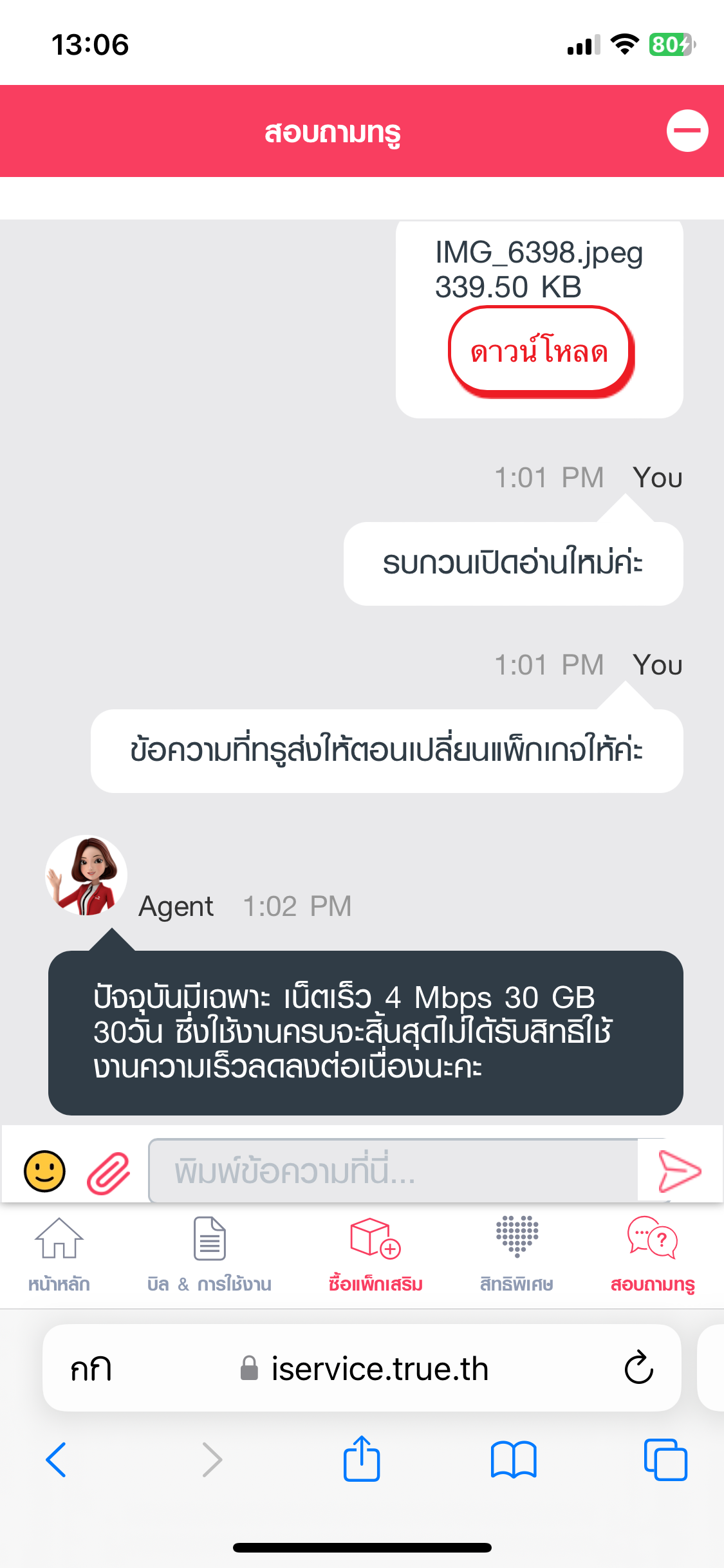 รบกวนสอบถามค่ะ พอดี งง คีะ ใช้เน็ตไม่ลดสปีดของทรู แบบใช้งานต่อเนื่อง ทุกๆเดือน แล้วอยู่ๆ ก็มีการเปลี่ยนแพ็กเกจ ให้โดยที่ไม่ได้แจ้งล่วงหน้า เป็นแพ็กเกจที่ตำลงมา แค่ค่าบริการเพิ่มขึ้น คือจาก เน็ตไม่จำกัด เร็ว 4 Mbps จำนวน 30GB หลังจากนั้นเร็ว 128Kbps 30วัน (ต่ออายุอัตโนมัติ) คุณมี Internet คงเหลือไม่จำกัดจำนวน สามารถใช้งานได้ถึง 29/03/2024 แต่วันนี้เปิดใช้งานเน็ตแล้วโดนตัดเงินจากซิมเฉยเลย พอถามพนักงาน ได้คำตอบว่า แพ็กเกจของใข้ครบแล้ว ก็เลยงง ค่ะ ขอความจากทรูและพนักงานทรู ตามรูปนะคะ คือพนักงานปิดแชตหนีเฉยเลย ให้คำตอบเราไม่ได้แล้วเราจะถามใคร
