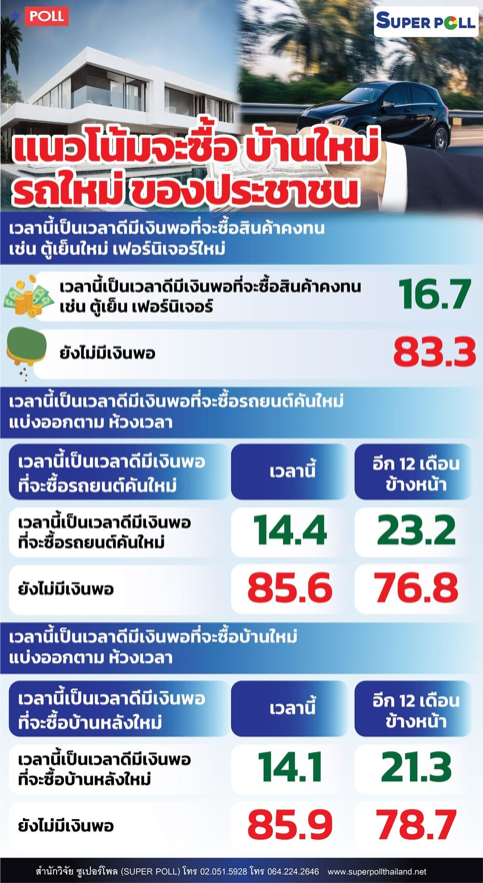 ซูเปอร์โพลเผย แนวโน้มคนไทยตอนนี้ ยังไม่มีเงินซื้อ บ้านใหม่ รถใหม่