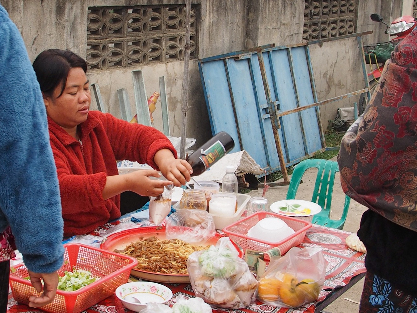 โซนด้านนอก ริมถนน จะเน้นเป็นวัตถุดิบทำอาหาร ผักสด เนื้อสัตว์สดมากกว่า ผมแอบไปถามราคามา อาหารที่นี้ถูกมาก อาจจะเป็นที่ค่าเงินไทยเเข็งแรงด้วย หัวกะหล่ำปลีที่เห็น 5-10 บาท ผัก กำละ 5-20 บาท เท่านั้นเอง
