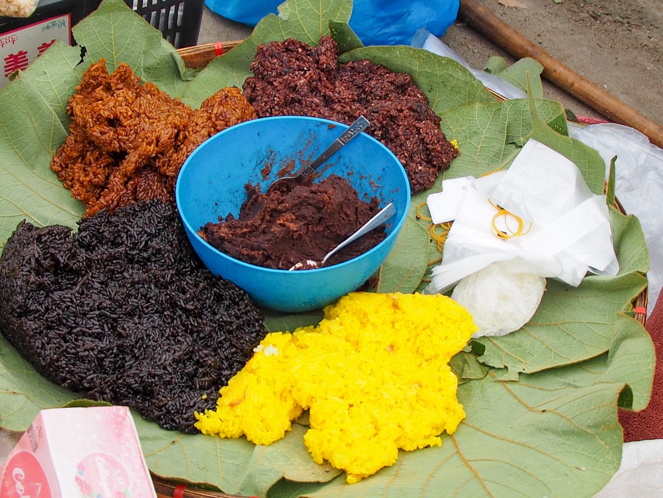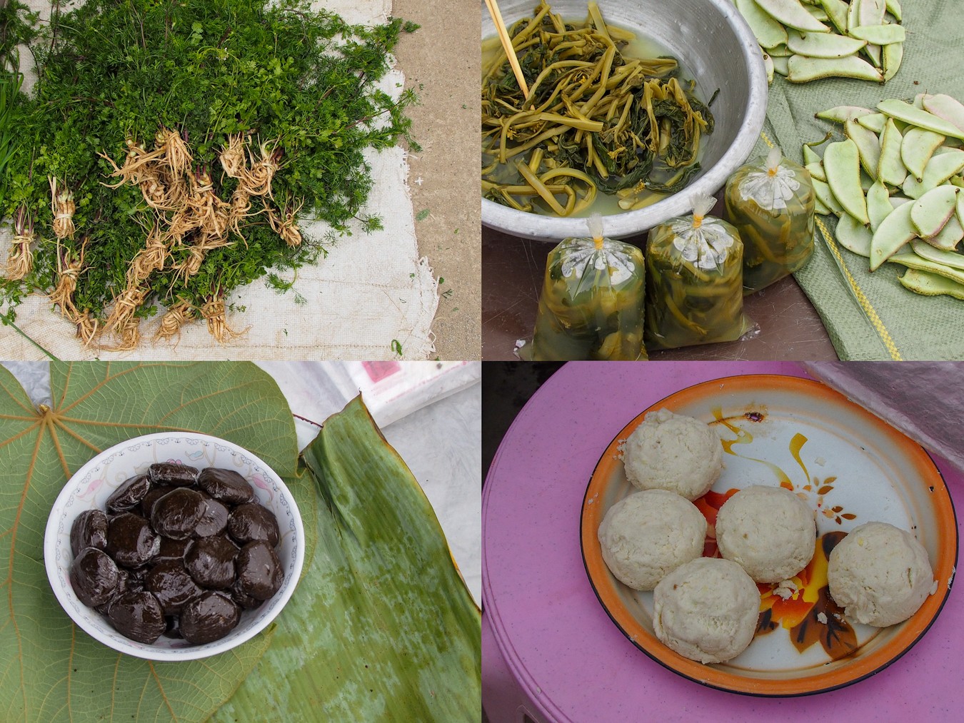 บนซ้าย เป็นผักพื้นเมืองอะไรซักอย่าง บนขวา เป็นผักกาดดอง มีรสเปรี้ยวหวาน ด่านล่างคือ งาบดที่เขาเอาไว้ผสมทำข้าวปุกงา สุดท้ายแป้งผสมถั่วเอาไว้ทำอะไรซักอย่าง ขออภัยครับ ตื่นเช้าเกิน ผมมึนจำอะไรไม่ค่อยได้ 555