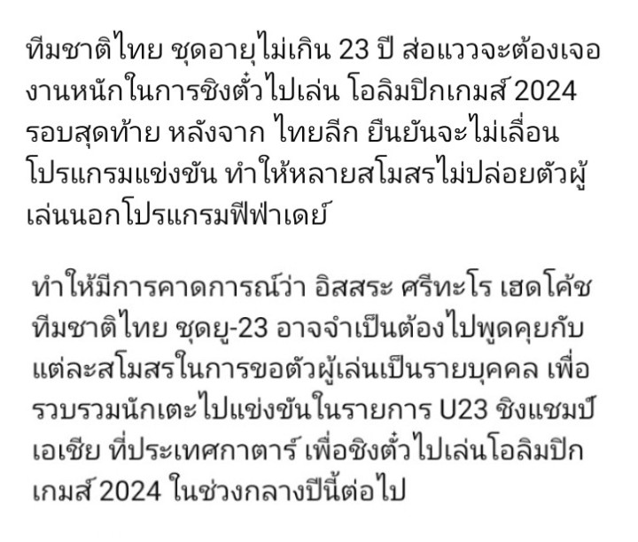 https://youtu.be/HbdkvYeKCJs?si=CMbHalyZH4ja7z3d * บิ๊กหยิม (ผู้จัดการทีมชุด U23) ออกมาแจงว่าต้องออกค่าใช้จ่ายจากเงินตัวเองทั้งหมด 100% ในชุดโอลิมปิก U23 ไม่ว่าจะ ค่าที่พัก ค่าสนาม ค่าอุ่นเครื่