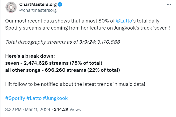 ✨ChartMasters รายงาน...ยอดสตรีมรายวันของ Latto เกือบ 80% มาจากเพลง 'Seven' ที่ฟีเจอร์กับ Jungkook.. (จองกุกอิมแพ็ค)