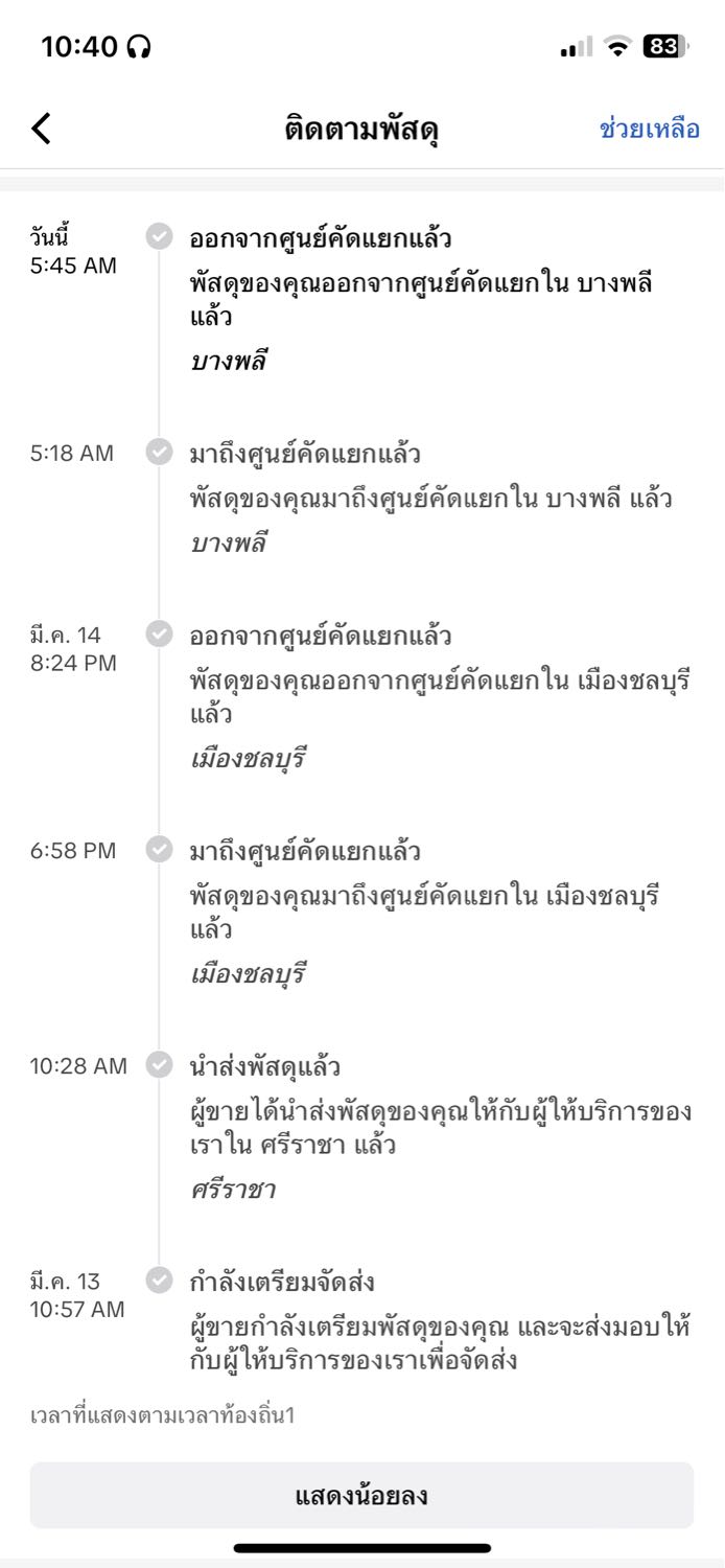 พอดีเราโทรติดตามเรื่องให้ลูกค้า เพราะสินค้าค้างอยู่ที่ศูนย์กระจายสินค้าค่ะ (ไม่อัพเดตสถานะเลย) เลยโทรเข้าไปสอบถามที่สำนักงานใหญ่ ได้รับคำตอบว่า สินค้าไม่สูญหาแน่นอน จะนำส่งอีก 2 วัน (ซึ่งอาจจะล่าช้า)
