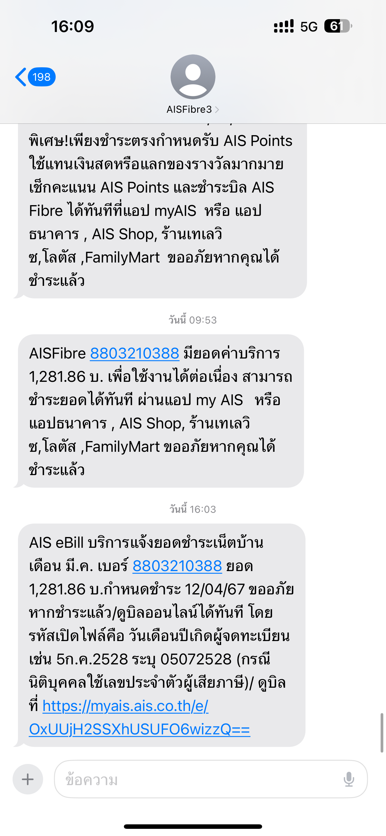 คือวันนี้มีsms แจ้งค่าบริการรายเดือน ais ซึ่งปกติเราจ่ายทุกเดือนเดือนละ400กว่าบาทแค่นั้นแต่เดือนนี้กลับมีข้อความส่งมาว่าต้องจ่าย600กว่าบาทซึ่งเรางงมากไม่ได้ไปสม