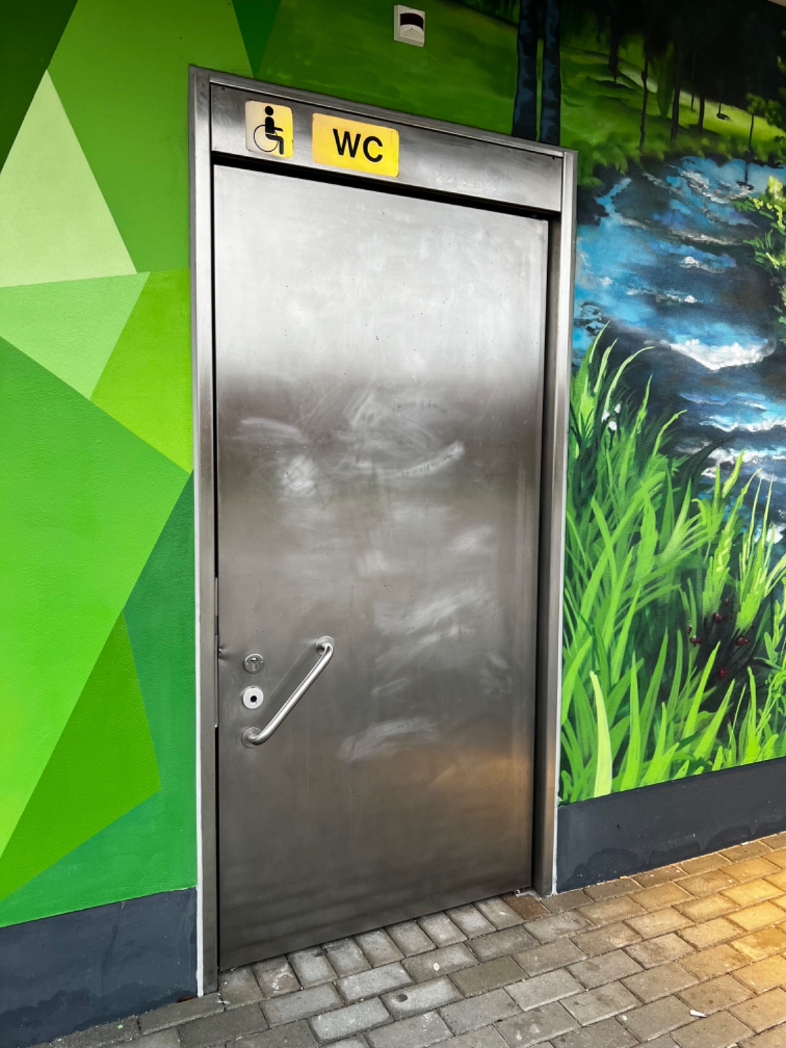ห้องน้ำสำหรับผู้พิการ ซึ่งมองเห็นสัญลักษณ์ได้ง่ายค่ะ แต่ต้องใช้ลูกกุญแจห้องน้ำยูโรไขนะคะ 😊