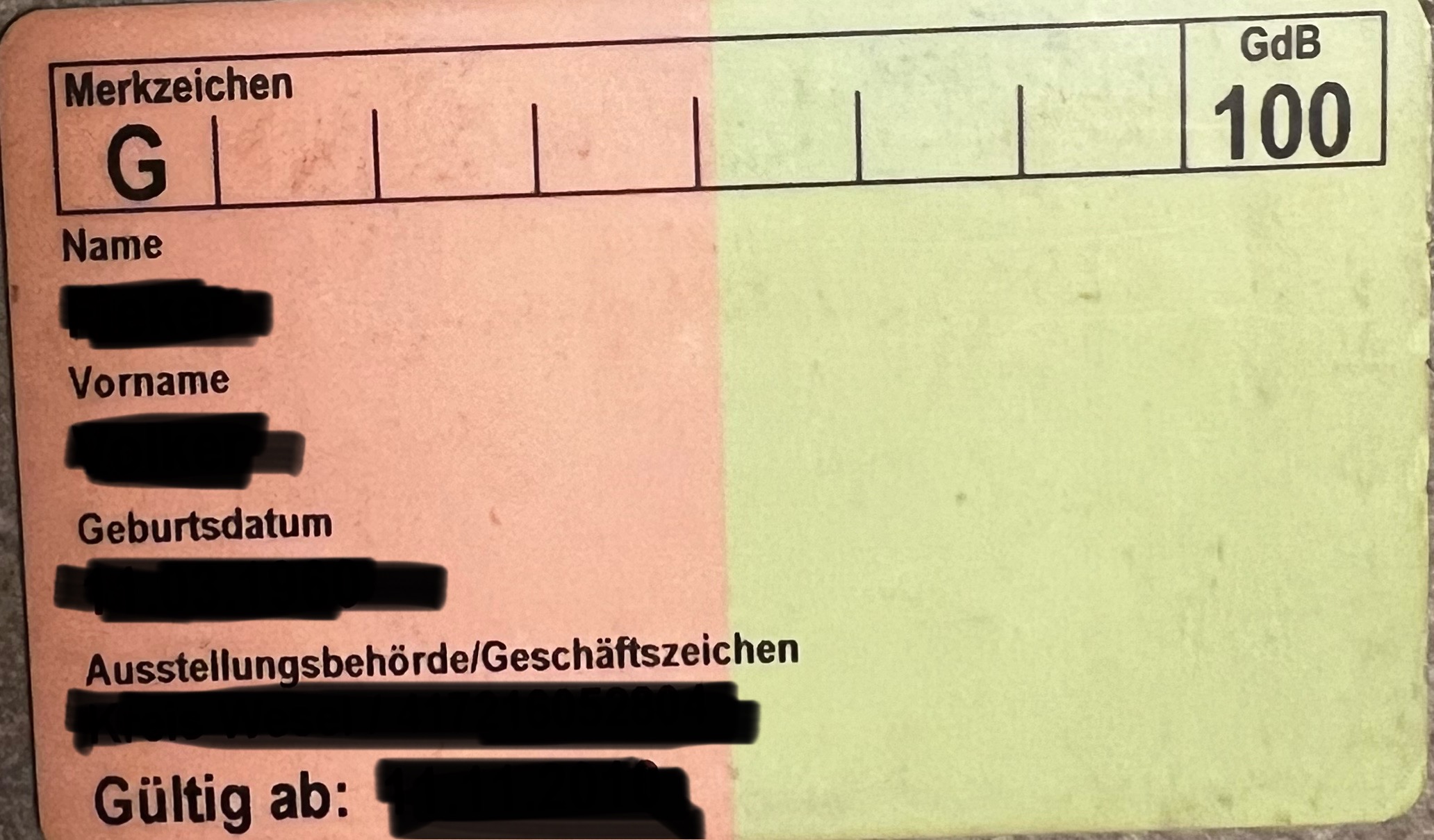 👉ผู้ที่ไม่สามารถเดินและ/หรือยืนได้และมีระดับความพิการอย่างน้อย (GdB) 70 (*เครื่องหมาย G บวก GdB 70 ขึ้นไป)