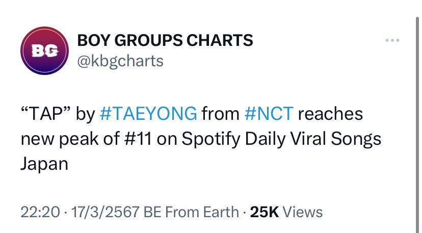 [NCT127] “TAP” โซโล่แทยงขึ้นชาร์ท New Peak อันดับที่ 11 Spotify Daily Viral Songs ประเทศญี่ปุ่น