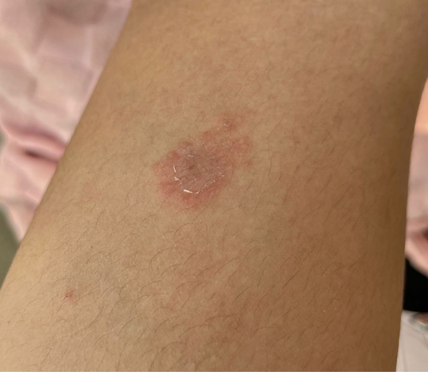 สวัสดีค่ะ ผื่นแดงแบบนี้เกิดจากอะไรคะ มีแค่บริเวณนี้บริเวณเดียวจากทั้งตัวเลยค่ะ ลักษณะจะเหมือนผื่นแดงๆค่ะส่วนตรงกลางจะเหมือนผิวแห้งๆหน่อยค่ะ ไม่รู้เป็นอะไรหรือโดนตัวอะไรกัดค่ะ🥹