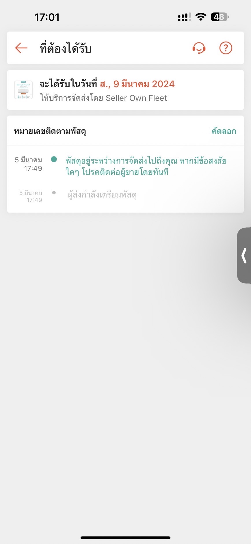 พอ 9 มีนา ทักไปถามบอกกำลังเตรียมจัดส่ง ( 5 วันแล้วยังไม่ส่ง ยังไม่ได้เลขแทรก )