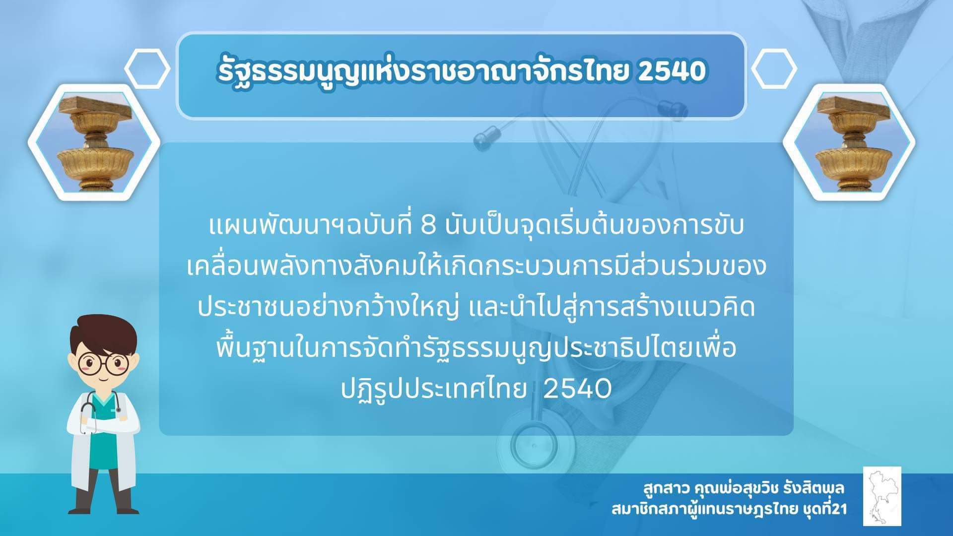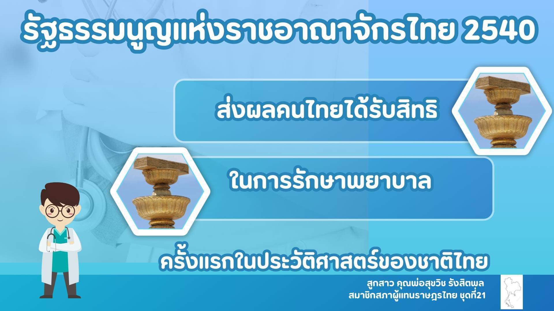 ความสำเร็จเป็นรูปธรรมของเบี้ยผู้สูงอายุภายใต้ปรัชญาเศรษฐศาสตร์สุขวิชโนมิกส์ Epigraph: รัฐธรรมนูญแห่งราชอาณาจักรไทย 2540 มาตรา 80 มาตรา๘๐ รัฐต้องคุ้มครองและพัฒนา