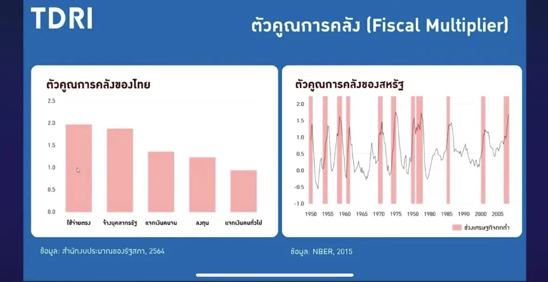 กรณีของประเทศไทยการแจกเงินนั้นเมื่อศึกษาจากในอดีตพบว่าตัวคูนทางเศรษฐกิจที่จะเกิดขึ้น จากการอัดฉีดเงินไม่ได้สูงอย่างที่รัฐบาลคาดการณ์ไว้ แต่หากไปดูข้อมูลจากในอดีตตัวคูนในการแจกเงินนั้นอยู่แค่ 0.4 - 0.5% ซึ่งไม่ได้เกิดพายุหมุนทางเศรษฐกิจแบบที่รัฐบาลบอก ส่วนเมื่อดูจากต่างประเทศก็จะพบว่าการแจกเงินตัวคูนทางเศรษฐกิจก็ไม่ได้มากยกเว้นว่าเวลาแจกในช่วงที่เศรษฐกิจตกต่ำมากๆ ซึ่งผลจากการศึกษาของสหรัฐฯการแจกเงินเข้าไปในระบบเศรษฐกิจหนึ่งดอลลาร์ตัวคูนทางเศรษฐกิจจะอยู่ที่ประมาณ 1 เท่าหรือต่ำกว่า 1 เท่าด้วยซ้ำ
