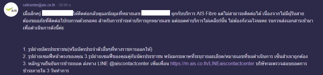 ใครเคยเจอบ้าง จ่ายบิลค่า AIS Fiber ถูกต้อง แต่ไม่ทำการตัดยอดบิลในระบบ เจ้าหน้าที่ให้ส่งหลักฐานเกี่ยวกับบัตรปชช.