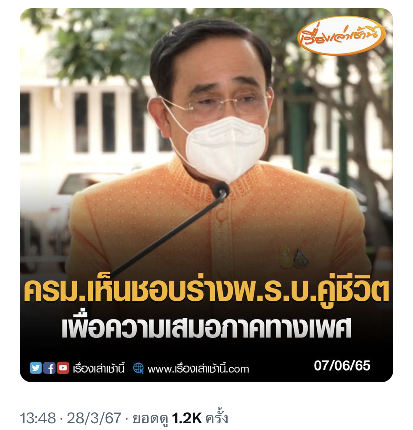 ที่ถูกคือ ต้องบอกว่า รัฐบาลพลเอกประยุทธ์ที่พวกคุณ ด่า กันนี่ล่ะ นำร่องเรื่องความเท่าเทียมให้พวกคุณแล้ว