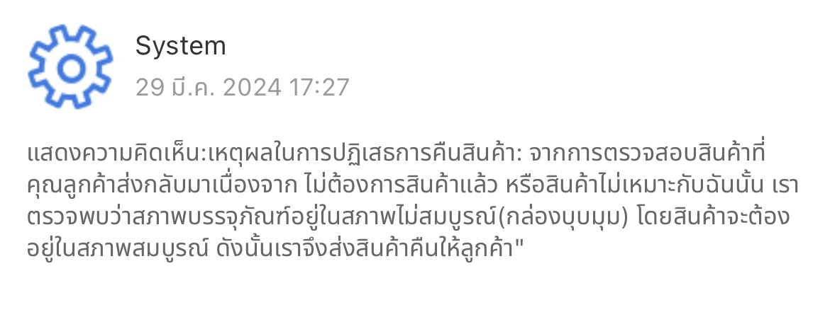 ภายหลังน้องได้บอกว่าพี่สาวได้ทำการซื้อมาก่อนแล้ว จึงตัดสินใจทำเรื่องคืนสินค้าด้วยเหตุผล 'เปลี่ยนใจ' และให้ขนส่งเข้ามารับสินค้าเมื่อวันที่ 27 มี.ค. 2567 เนื่องจากเพิ่งสะดวกอยู่ส่งสินค้า ต่อมาเช็คในระบบว่าอยู่ในขั้นตอนใด เมื่อวันที่ 29 มี.ค. 2567 ได้เห็นข้อความในระบบแจ้งว่า 'ปฏิเสธการคืนสินค้า' จากสาเหตุ 'กล่องบุบมุม'