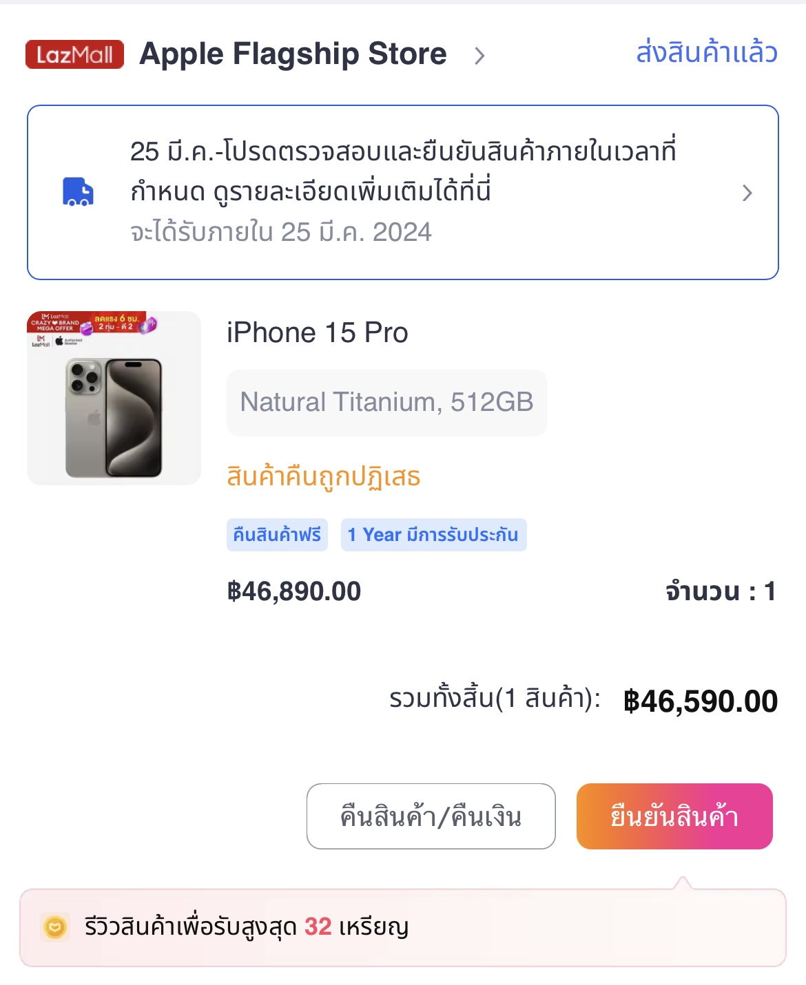 ผมได้สั่ง Iphone 15 pro 512 gb จาก Apple flagship store ใน Lazada เมื่อวันที่ 24 มี.ค. 2567 เพื่อเป็นของขวัญให้พี่สาว และได้รับสินค้าเมื่อวันที่ 25 มี.ค. 2567 สภาพกล่องบรรจุสินค้าเป็นดังรูป และยังไม่ได้แกะซีล