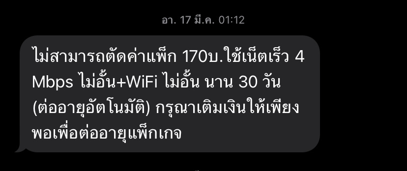 ปกติใช้เน็ตทรูแพ็ค4mbpsไม่อั้น+Wifiไม่อั้นแต่ระบบแจ้งเตือนตอนเน็ตหมดว่าต้องเติม170บาทก็ไม่ได้สนใจเพราะว่าใช้แพ็ค150มาเป็นปีๆแล้ว แต่อยู่ๆ150ก็หักไปโปรอื่นใช้เน็ตไม่ถึงเดือน เน็ตก็หมดแล้ว