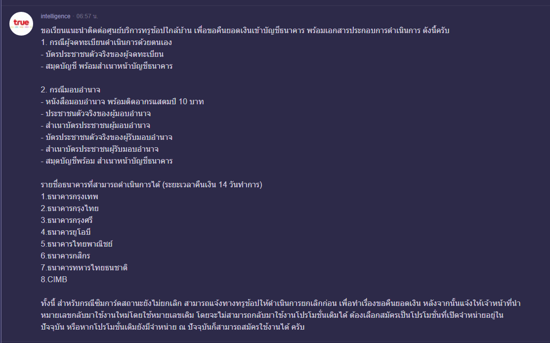 true เติมเงินมือถือผ่านธนาคารออนไลน์ พอจะขอคืนเพราะเปลี่ยนโปรโดยไม่แจ้ง ให้ไปทำเรื่องที่สาขานะครับ