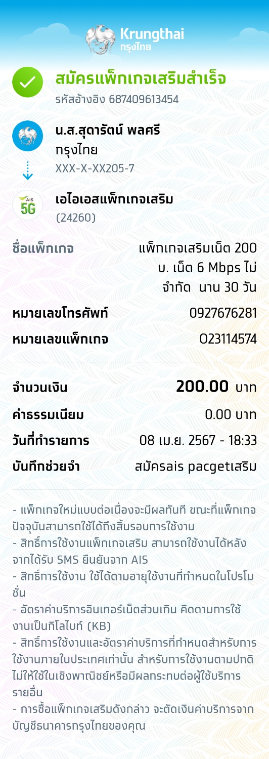 สวัสดีค่ะ ขอสอบถามเกี่ยวกับการสมัครแพ็คเก็จเสริมที่ my ais แต่ยังไม่มีข้อความเข้าค่ะ ชำระเงินผ่านแอปธนาคารกรุงไทยไปแล้ว จำนวน 200฿