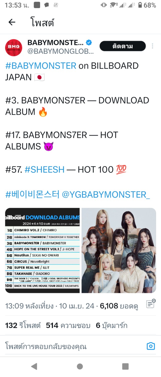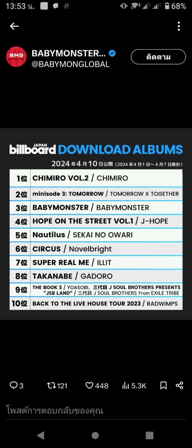 อัลบั้ม DRIP ของ BABYMONSTER อยู่ ในอันดับที่ 12 บน Billboard Japan Hot Album Chart นับเฉพาะอัลบั้ม ของศิลปินเคป๊อปอยู่อันดับที่ 2 ปลื้มใจ K-POP Albums On Billboard Japan Hot Album Chart Last Week : 1