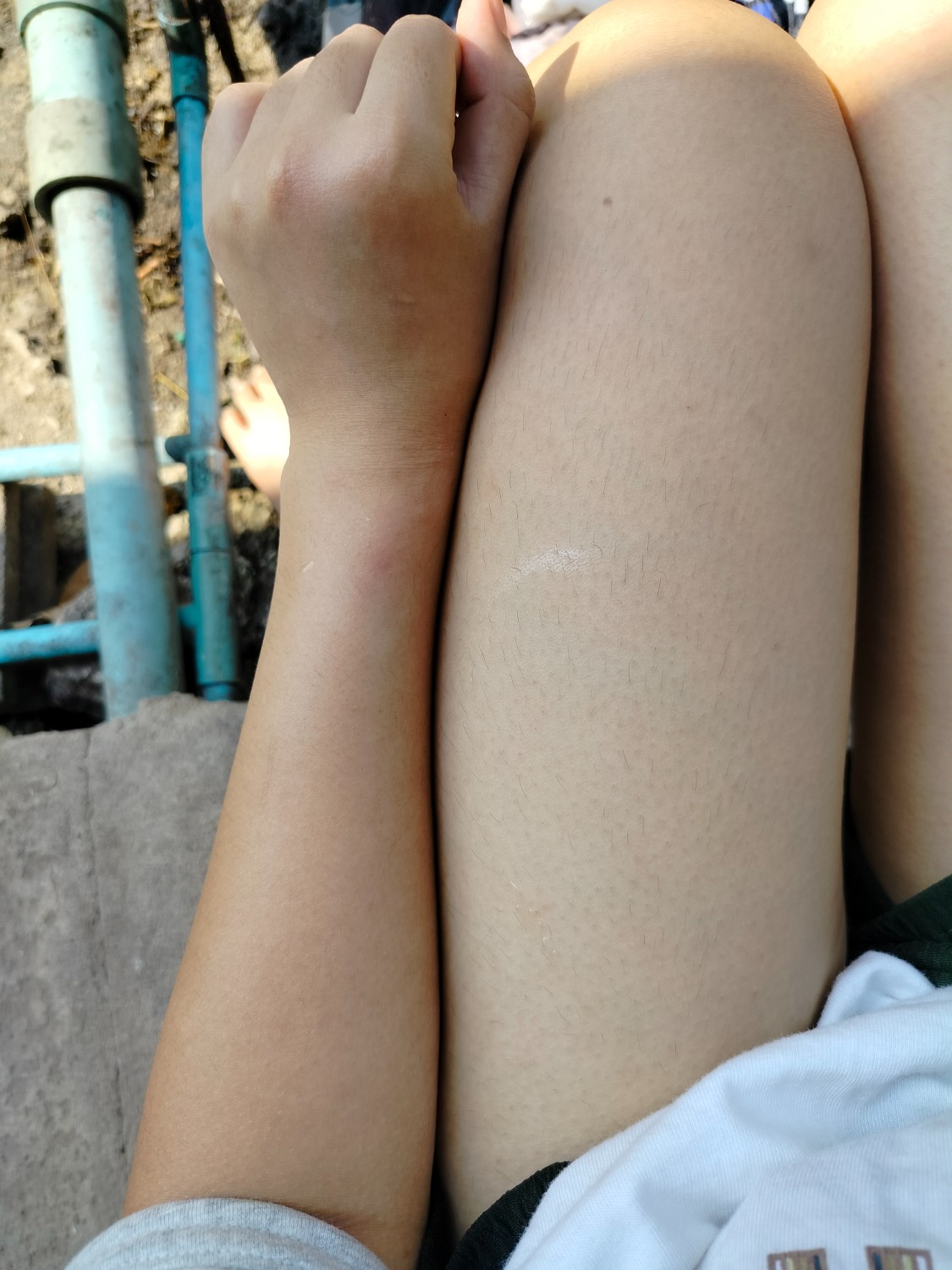 อันนี้แขนเทียบกับขาเรา เราทาทั้งกันแดด ใส่เสื้อกัน UV ทาครีม กินวิตามินซี ตอนนี้เหลือแค่สครับผิวแล้วค่ะ แหะๆ