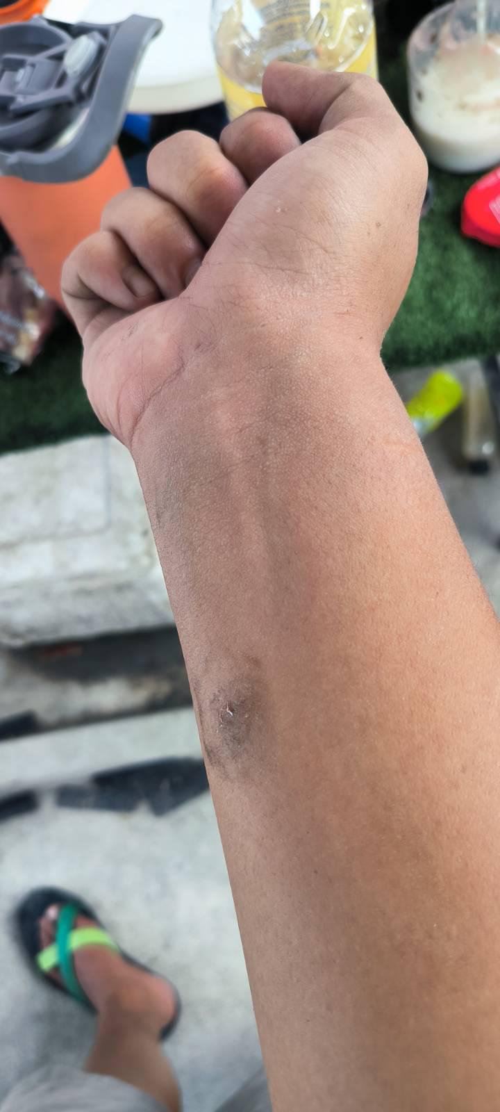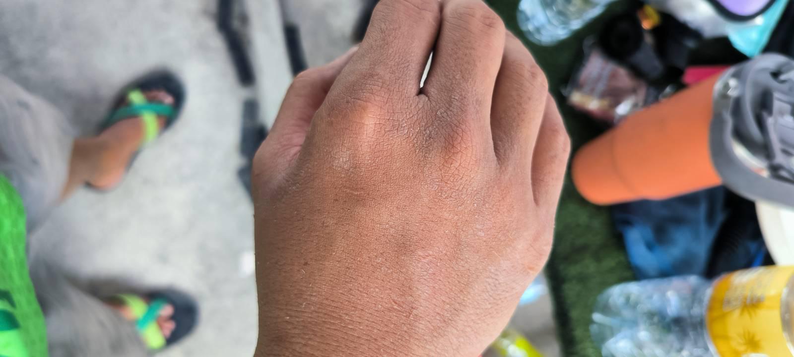 มันเป็นเหมือนผื่นเลยครับแต่ไม่มีอาการคัน พอโดนน้ำจะเห็นชัดแบบนี้ พอโดนน้ำหนังมันเหมือนจะเปื่อย ไม่ทราบด้วยว่าโดนอะไรมา ไปเภสัชเขาก็ให้คำตอบไม่ได้