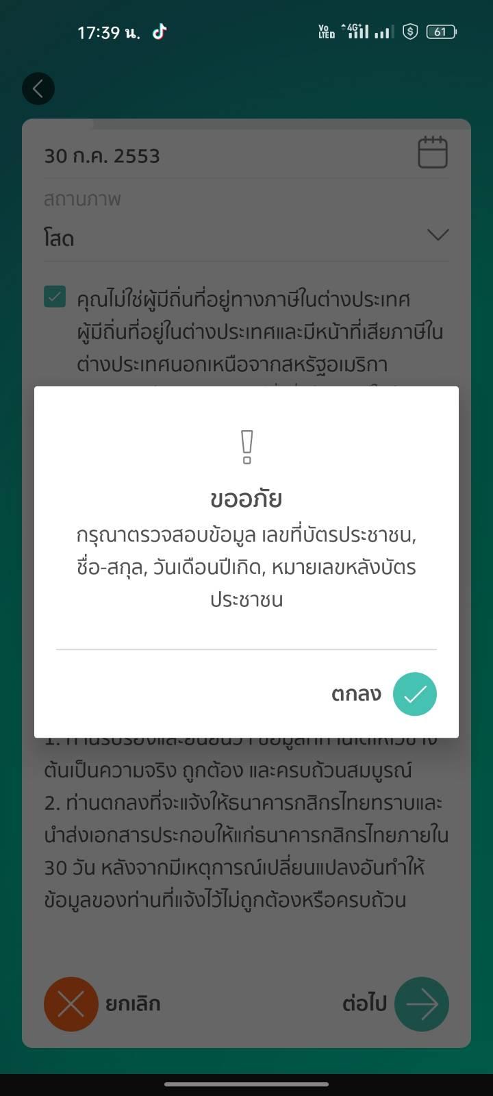 พอถึงขั่นตอนสุดท้ายพอกดถัดไป มันก็ขึ้นตามภาพ ลองตรวจทุกตัวอักษรเเละตัวเลขทุกอย่างถูกต้องก็ไม่สามารถสมักใด้ ใช้เน็ตมือถือตั่งเเต่โหลดมาเลย