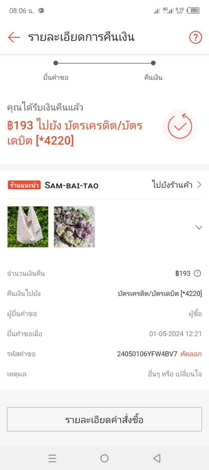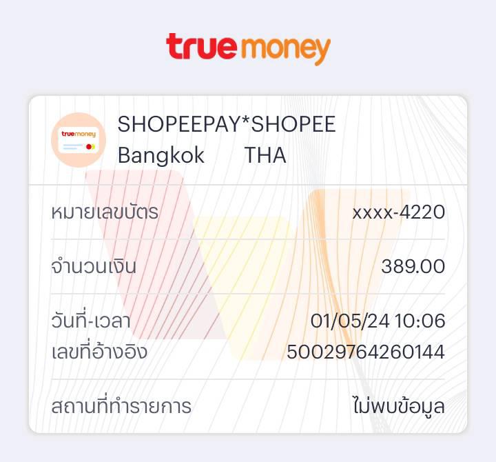 ผมได้สั่งซื้อของจาก Shopee เมื่อวันที่ 19 พ.ค.64 โดยจ่ายเงินผ่านทางTruemoney wecard บัตรเป็นแบบ Master card แต่ทางร้านค้าแจ้งว่าสินค้าหมด และได้คืนเงินให้ โดยผมตรวจสอบกับทางShopee แล้วพบว่าท