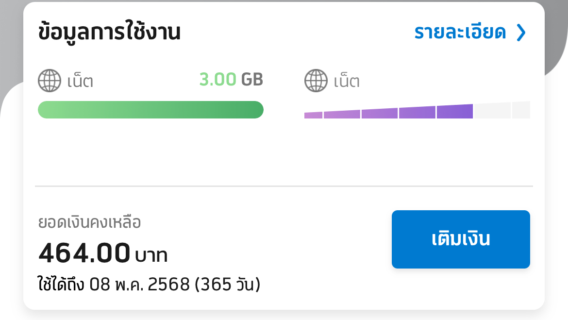 ใช้ทรูมูฟเอชแบบเติมเงิน แพ็คเกจเน็ต 10GB 30 วัน+คูปองส่วนลด McDonald 200 บาท ต่ออายุอัตโนมัติ ใช้งานได้ถึง 28/11/2568 23:59:59 มีเงินเหลืออยู่เกือบ 50 บาท หลังเที่ยงคืนวันที่ 13/11/2568่ ใช้เน็ตถึงเที