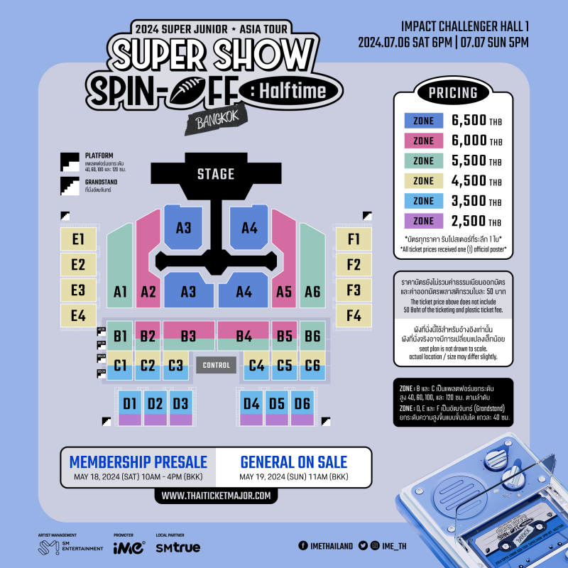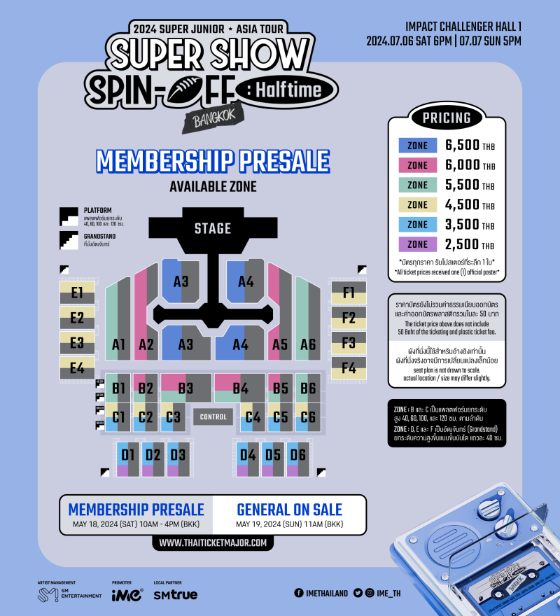 งาน 2024 SUPER JUNIOR <SUPER SHOW SPIN-OFF : Halftime> in BANGKOK เปิดขายบัตรรอบ Pre-Sale สำหรับ E.L.F. Membership ในวันเสาร์ที่ 18 พฤษภาคม 2567 เวลา 10.00 – 16.00 น. ผ่านทาง www.thaiticketmajor.com เท่านั้น และจะเปิดขายบัตรรอบปกติในวันอาทิตย์ที่ 19 พฤษภาคมนี้ ตั้งแต่เวลา 11.00 น. เป็นต้นไป ผ่านทาง ไทยทิกเก็ตเมเจอร์ทุกสาขา หรือ www.thaiticketmajor.com และ Call Center 02-262-3456 บัตรราคา 6,500 / 6,000 / 5,500 / 4,500 / 3,500 และ 2,500 บาท (บัตรนั่งทุกที่นั่ง)