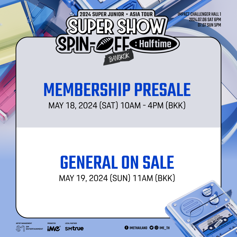 ไอมี่ไทยแลนด์ (iMe Thailand) ผู้จัดสายเปย์ สายทุ่ม เสิร์ฟความฟินให้แฟนคลับชาวไทยรัวๆ ตั้งแต่ต้นปี ล่าสุดถึงคิว “เอลฟ์ไทย” (E.L.F. : ชื่อแฟนคลับ) จะได้ใจฟูไปกับศิลปินนัมเบอร์วันของใจ “SUPER JUNIOR” ทั้ง 8 เมมเบอร์ “อีทึก, เยซอง, ชินดง, อึนฮยอก, ทงเฮ, ชีวอน, รยออุค” และ “คยูฮยอน” ที่จะกลับมาเจอให้หายคิดถึงในรอบ 2 ปี กับงาน 2024 SUPER JUNIOR <SUPER SHOW SPIN-OFF : Halftime> in BANGKOK จะจัดขึ้นในวันเสาร์-อาทิตย์ที่ 6-7 กรกฎาคม 2024 ณ อิมแพค ชาเลนเจอร์ ฮอลล์ 1 เมืองทองธานี งานนี้จัดเต็มอย่างยิ่งใหญ่สมศักดิ์ศรีสุดบอยแบนด์ระดับตำนานแน่นอน