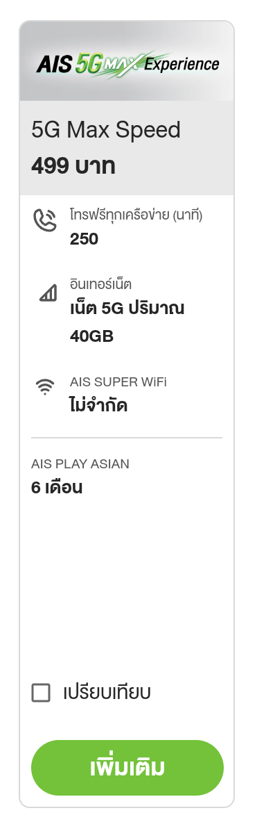 สวัสดีค่ะตั้งใจจะซื้อเน็ตของ AIS จะเป็นรายเดือนราคาประมาณ 300 แบบไม่ลดสปีด หรือจะเป็นรายเดือนราย 6 เดือน ช่วยหลังไมค์ให้ทีค่ะเพราะไม่รู้ว่าจะติดต่อกับ AIS ทางไหนหรือหาโปรโมชั่นจากทางไหน