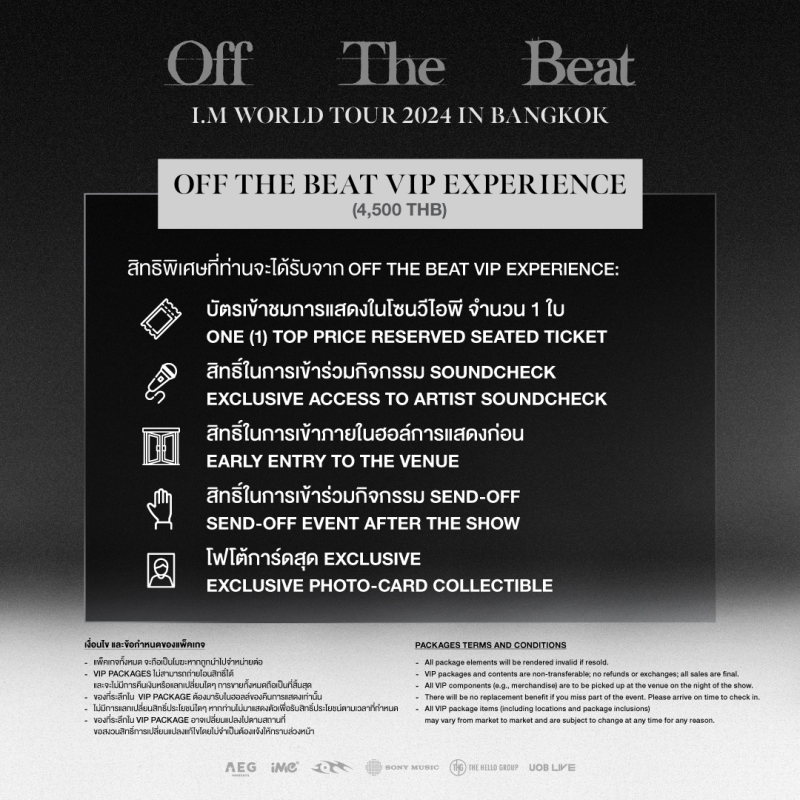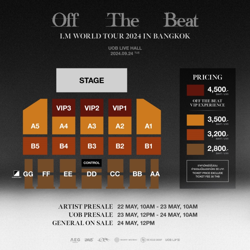 ผู้จัด “เออีจี พรีเซ้นต์ เอเชีย” (AEG Presents Asia) และ “ไอมี่ไทยแลนด์” (iMe Thailand) พร้อมแล้วที่จะเสิร์ฟความมันส์กับคอนเสิร์ตเดี่ยวครั้งแรกของ “I.M” กับงาน “I.M (MONSTA X) presents Off The Beat World Tour 2024 Bangkok” จะจัดขึ้นในวันอังคารที่ 24 กันยายน 2567 ณ ยูโอบี ไลฟ์ (UOB Live) บัตรราคาเริ่มต้น 2,800 บาท โดยจะเปิดขายบัตรในรอบ Artist Presale [ใช้ Presale code สำหรับการซื้อบัตร] ในวันพุธที่ 22 พฤษภาคม 2567 ตั้งแต่เวลา 10.00 น. ถึง วันพฤหัสบดีที่ 23 พฤษภาคม 2567 เวลา 10.00 น. ต่อด้วยขายบัตรในรอบ UOB Presale ในวันพฤหัสบดีที่ 23 พฤษภาคม เวลา 12.00 น. ถึง วันศุกร์ที่ 24 พฤษภาคม เวลา 10.00 น. และหลังจากนั้นจะเปิดขายบัตรในรอบปกติในวันศุกร์ที่ 24 พฤษภาคม 2567 ตั้งแต่เวลา 12.00 น. เป็นต้นไป ผ่านทาง www.thaiticketmajor.com