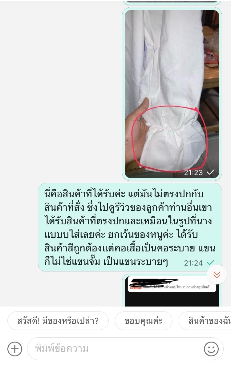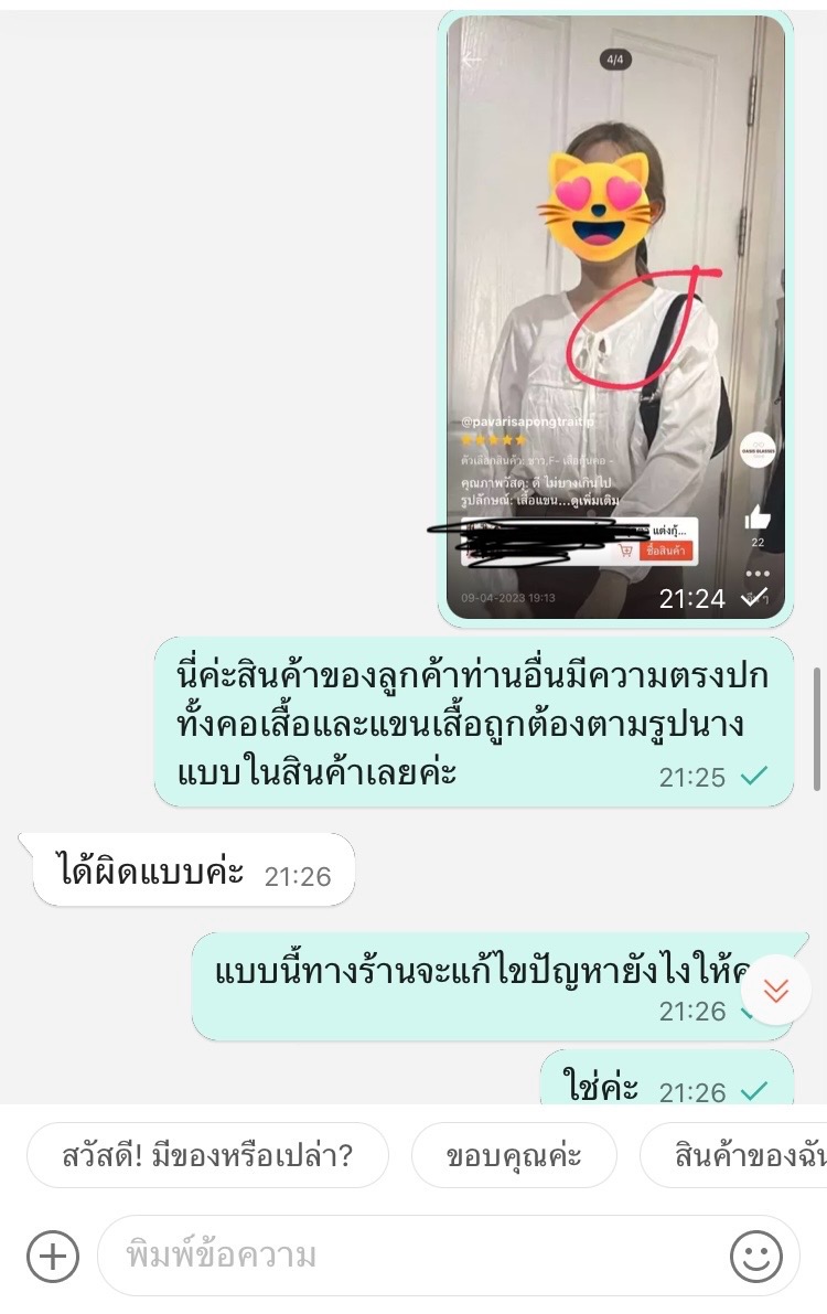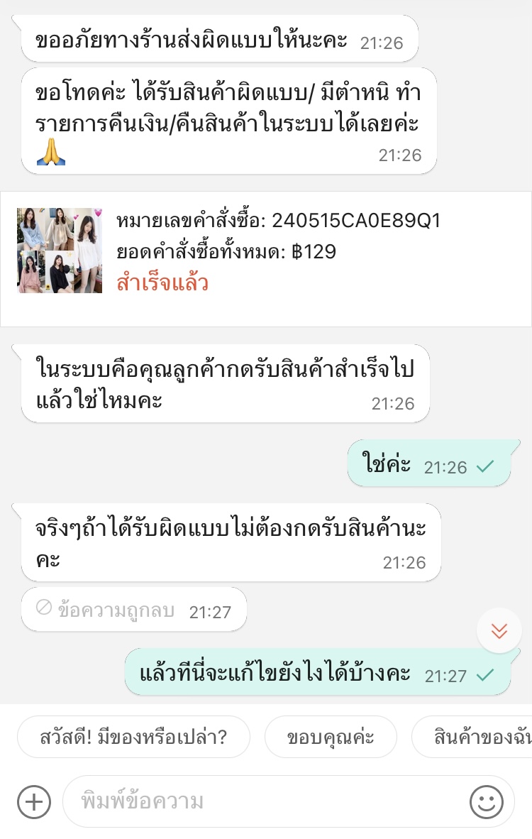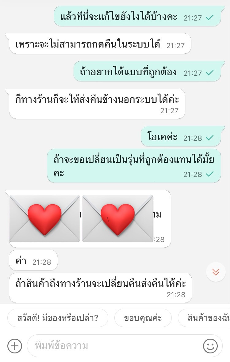เราเลยทักไปคุยกับร้านค้า เรารู้ตัวว่าเราผิดจริงๆที่ดันไปกดยอมรับสินค้าก่อนแกะสินค้าแต่เราอยากแค่ขขอร้านค้า