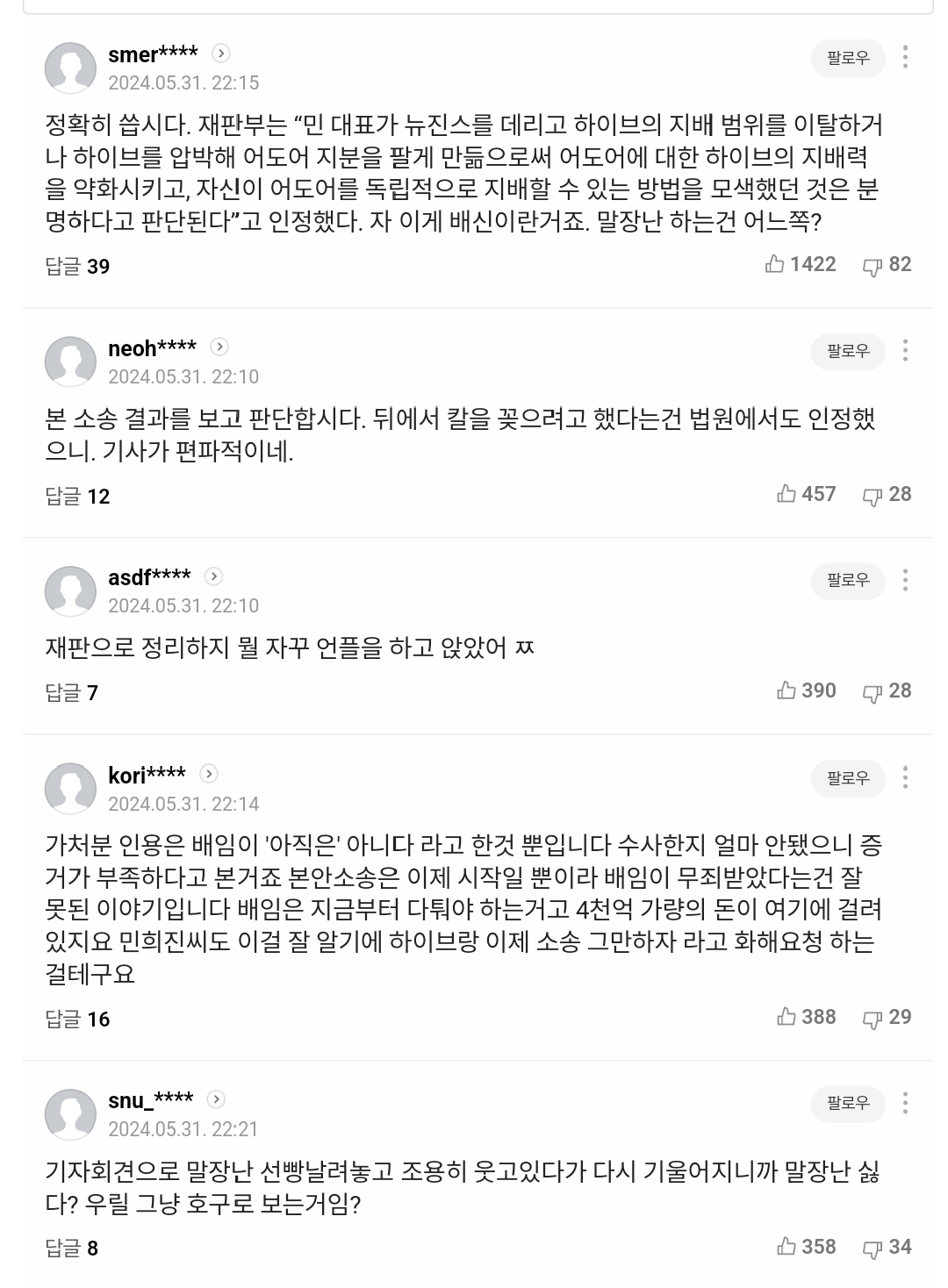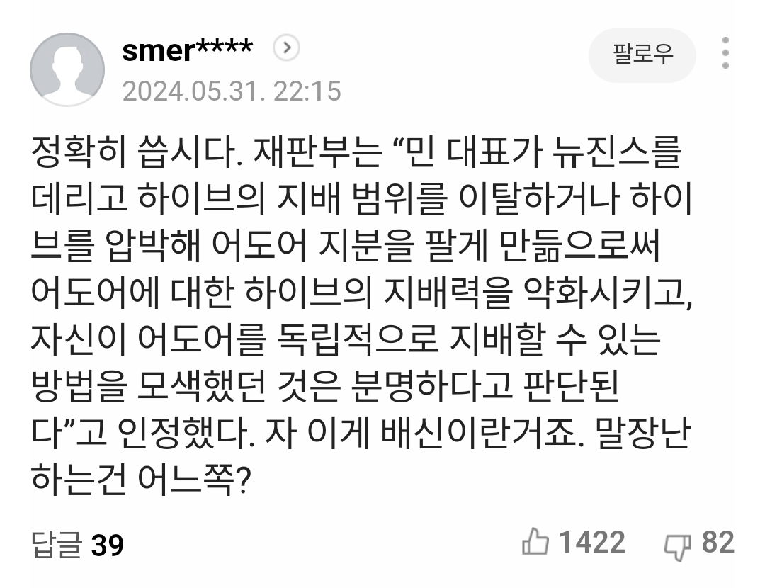 ศาลกล่าวว่า “มินฮีจินทำให้การควบคุม Ador ของ Hybe อ่อนแอลง โดยพยายามทำให้ NewJeans ออกจากการควบคุมของ Hybe ไหรือกดดัน Hybe ให้ขายหุ้นใน Ador และทำให้เขาสามารถควบคุม Ador ได้อย่างอิสระ เห็นได้ชัดว่าเป็นหนทางที่ต้องการแยกตัวแย่งการจัดการ นี่คือการทรยศ อันไหนที่ Hybe มีเดียเพลย์? (ดูยอดกดไลค์ซะก่อน 1,422 ไลค์)