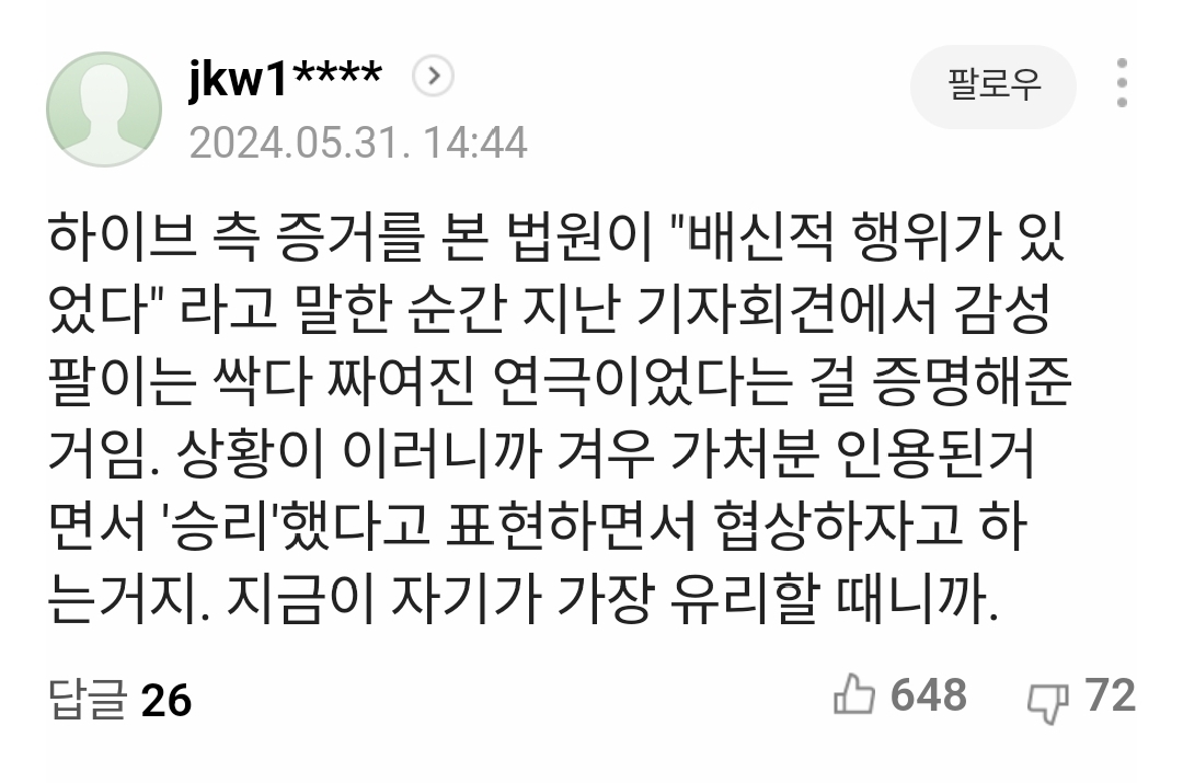 ทันทีที่ศาลเห็นหลักฐานของ Hybe ก็กล่าวว่า "มีการกระทำที่ทรยศ" มันก็พิสูจน์ได้ว่าการตอบสนองทางอารมณ์ในงานแถลงข่าวครั้งล่าสุดเป็นละครที่วางแผนไว้อย่างสมบูรณ์ เนื่องจากสถานการณ์เช่นนี้พวกเขาบอกว่าเพิ่งได้รับคำสั่งห้ามชั่วคราวและชนะแล้วและกำลังขอให้เจรจา เพราะตอนนี้เป็นเวลาที่ได้เปรียบที่สุด (ยอดไลค์ 648)