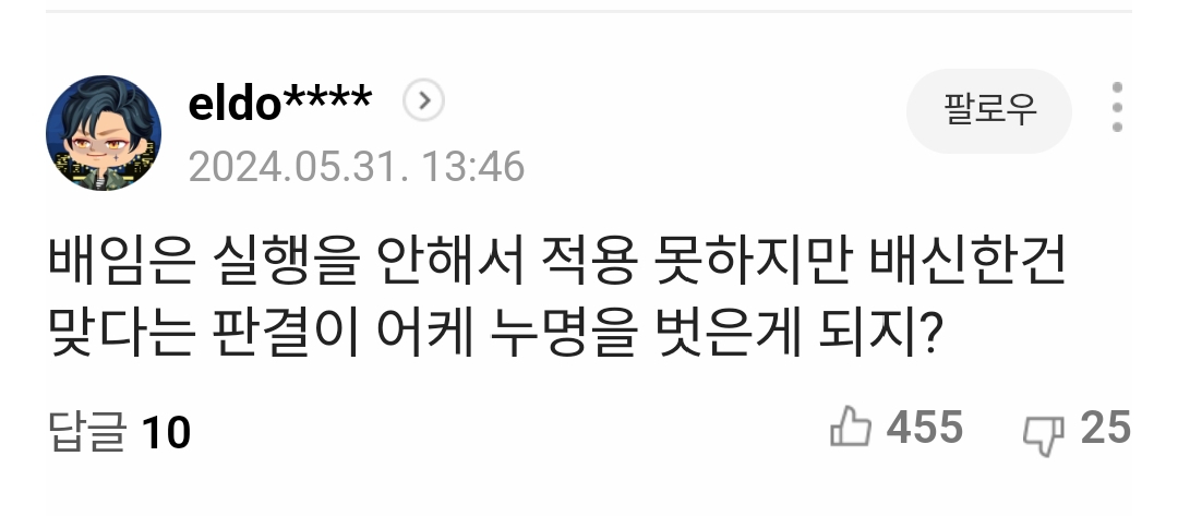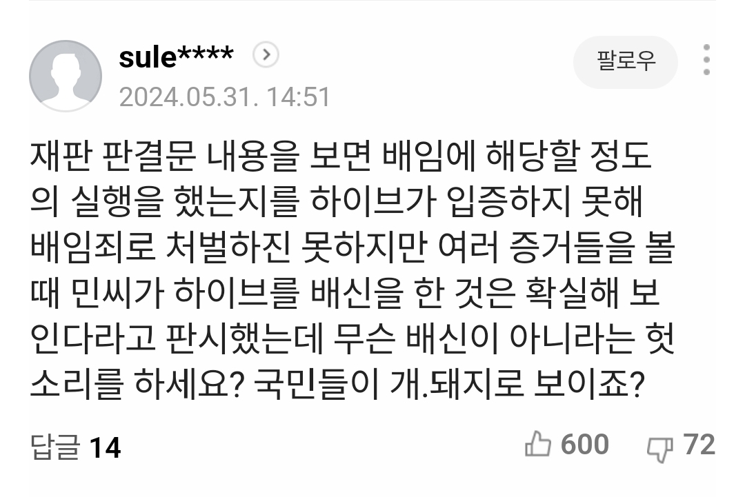 หากดูคำตัดสินของศาลจะลงโทษการละเมิดความไว้วางใจไม่ได้เนื่องจากไม่สามารถพิสูจน์การกระทำของเขาได้ อย่างไรก็ตาม เมื่อดูจากหลักฐานต่างๆ แล้ว พบว่าดูเหมือนว่ามินฮีจินทรยศต่อ Hybd แต่คุณกำลังพูดไร้สาระว่ามันไม่ใช่การทรยศ เพื่ออะไร?