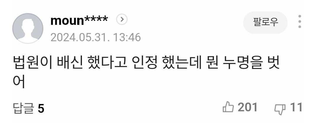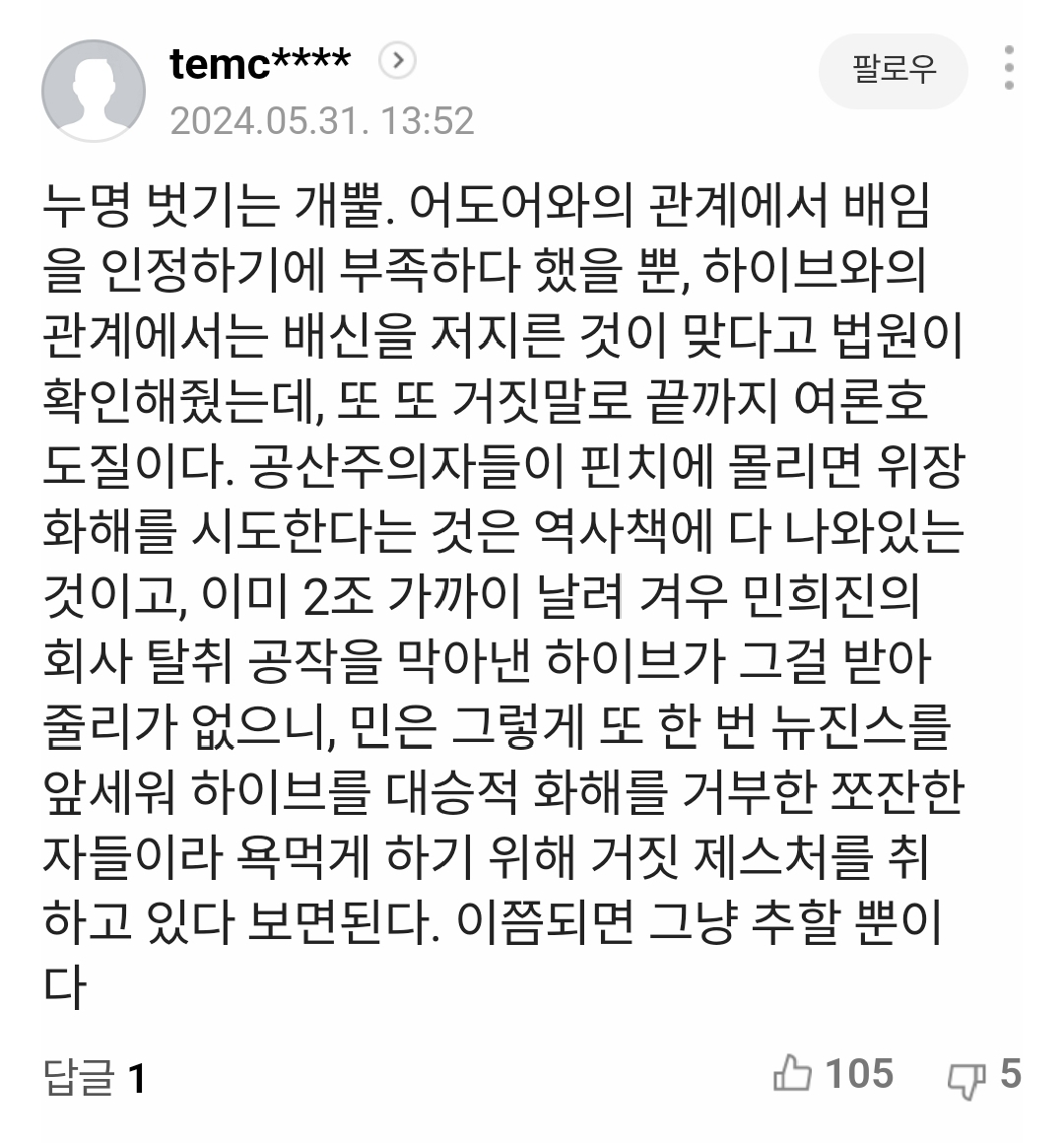 การเคลียร์ชื่อเป็นเรื่องไร้สาระ ศาลเพียงกล่าวว่าการทรยศต่อ Ador นั้นไม่เพียงพอ แต่ศาลยืนยันว่าเป็นความจริงที่เขากระทำการทรยศต่อ Hybe เป็นอีกครั้ง ที่เขาทำให้ความคิดเห็นของสาธารณชนเข้าใจผิดและจบลงด้วยการโกหก ทั้งหมดนี้อยู่ในหนังสือประวัติศาสตร์ที่คอมมิวนิสต์พยายามปลอมแปลงการปรองดองเมื่อพวกเขาตกอยู่ในสถานการณ์ลำบาก และไม่มีทางที่ Hybe จะยอมรับสิ่งนั้น หลังจากที่สูญเสียไปเกือบ 2 ล้านล้านวอนแล้ว และแทบจะไม่สามารถหยุดยั้งความพยายามของมินฮีจินที่จะเข้ายึดครอง Ador เขาจึงเข้ามารับหน้าที่ Newjeans อีกครั้ง เรียกได้ว่าทำเรื่องผิดๆ เพื่อทำให้ Hybe อับอาย ทั้งที่เป็นคนใจแคบแต่มาเรียกหาการปรองดอง ณ จุดนี้มันน่าเกลียดมาก
