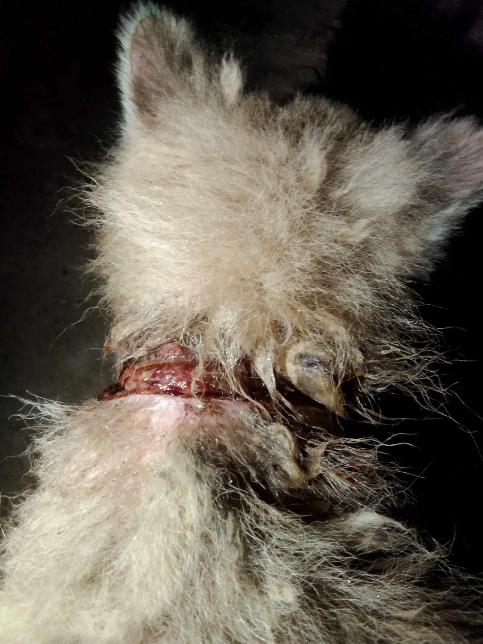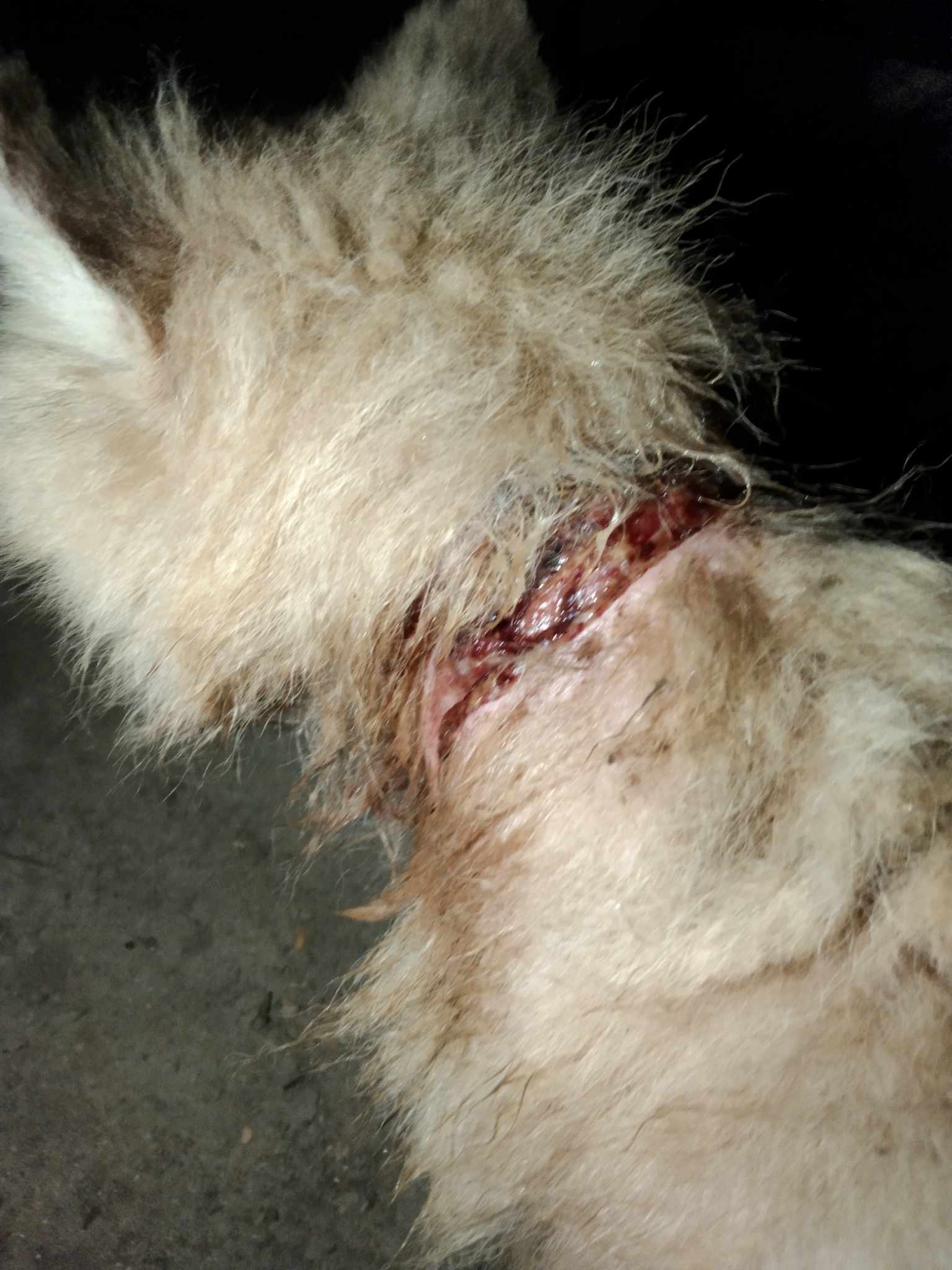 น้องหมาแถวบ้านเป็นแผลเหวอะคล้ายรอยฟันที่คอหรือโดนอะไรลัดคอควรทำยังไงดีคะ