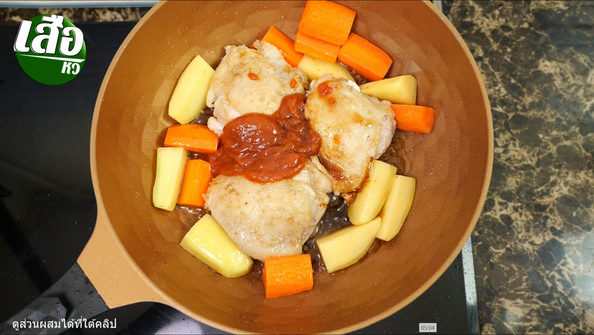 ใส่เนย ลงไปและตามด้วยมันฝรั่งและแคร์รอต หลังจากมีกลิ่นหอมแล้ว ใส่ไก่ลงไป หลังจากนั้นตามด้วย ซอสมะเขือเทศ และ ซอสปรุงรส จิ๊กโฉ่ว ซีอิ๊วดำ หลังจากนั้นเติมน้ำให้ท่วมไก่