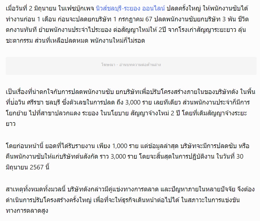 บริษัทดังในชลบุรี ปลดครั้งใหญ่ พนักงานกว่า 3,000 ชีวิต ตกงานทันที