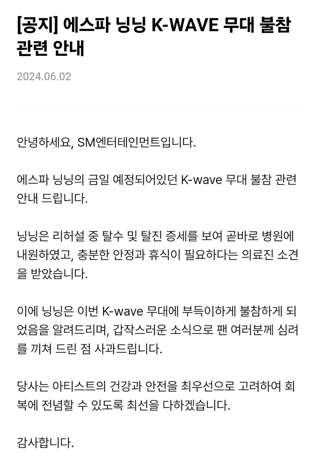 หนิงหนิงไม่สามารถเข้าร่วมงาน K-WAVE ที่จะจัดขึ้นในวันนี้ได้เนื่องจากปัญหาทางสุขภาพ