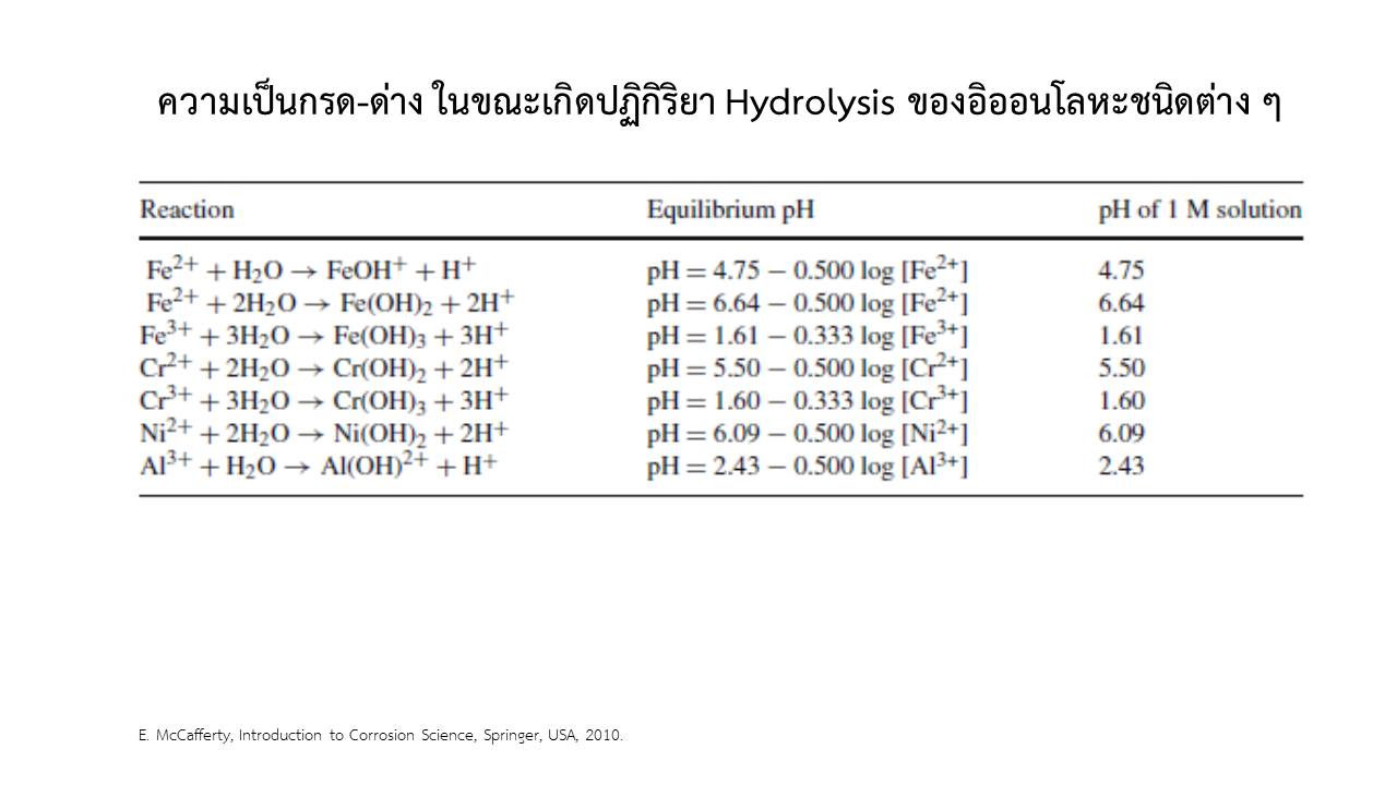 และอิออนโลหะที่ออกมายังเกิดปฏิกิริรยาไฮโดรไลซิส (Hydrolysis) ได้ต่อซึ่งจะทำให้น้ำแตกตัวกลายเป็น H